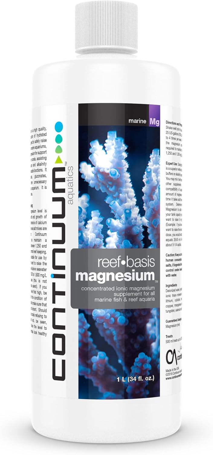 Continuum Aquatics Reef Basis Magnesium is a premium supplement designed to maintain proper magnesium levels in marine aquariums. Magnesium plays a crucial role in regulating calcium and alkalinity, supporting healthy coral growth and overall water stability. Without adequate magnesium, corals struggle to absorb calcium, leading to weak skeletal structures and inconsistent pH levels. Reef Basis Magnesium is formulated with high-quality, ionically balanced magnesium salts that dissolve easily and integrate seamlessly into saltwater aquariums. Unlike competing products that contain unnecessary additives, this solution is free from phosphates and unwanted organics, ensuring a clean and effective way to sustain marine life. By maintaining a magnesium level between 1,250 and 1,350 mg/L, aquarists can promote vibrant coral growth and prevent fluctuations in essential water parameters. For those aiming for specialized applications, Reef Basis Magnesium can be used to raise magnesium levels from 1,500 to 1,800 mg/L. However, it's important to monitor coral responses closely and adjust as needed to maintain a healthy marine environment. Whether used in reef aquariums, fish-only tanks, or mixed setups, this supplement ensures long-term stability and optimal conditions for marine inhabitants.