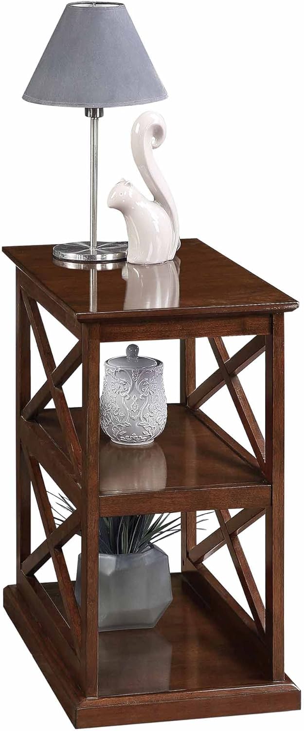 Bring classic charm and everyday functionality to your home with the Coventry Chairside End Table with Shelves by Convenience Concepts. Inspired by farmhouse, coastal, and transitional design, this compact yet stylish piece features a signature X-frame design on the sides for a touch of rustic elegance. The spacious tabletop with finely beveled edges offers the perfect spot for a lamp, book, or cup of coffee, while two open lower shelves provide convenient storage or display space for baskets, décor, or household items. Crafted from a mix of solid and manufactured wood and finished in a non-lead-based paint with a beautiful veneer, this table is both sturdy and easy to maintain. Lightweight enough to move when needed, it’s an ideal addition to any room in your home. Pair it with other coordinating pieces from the Coventry Collection by Convenience Concepts to complete the look, each sold separately.