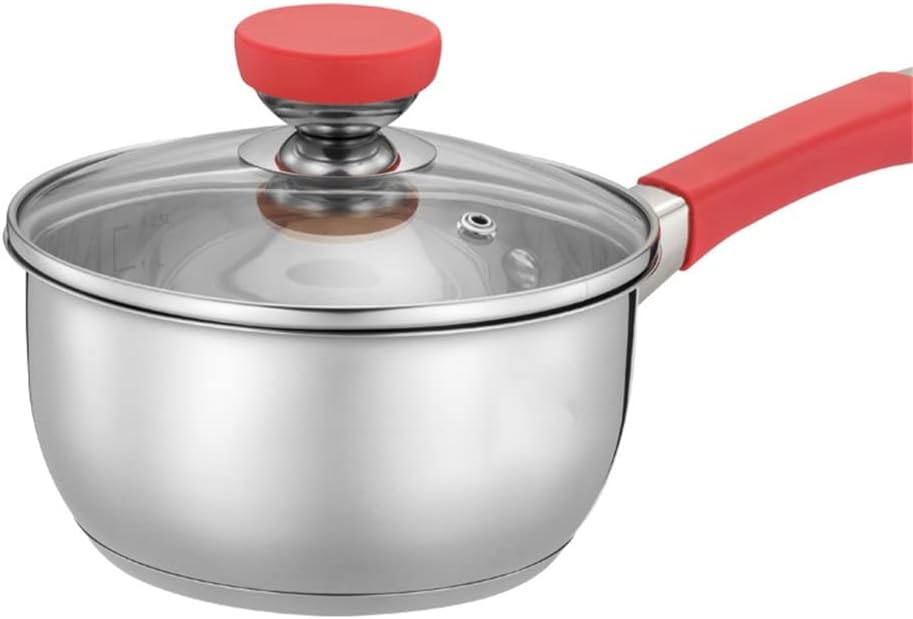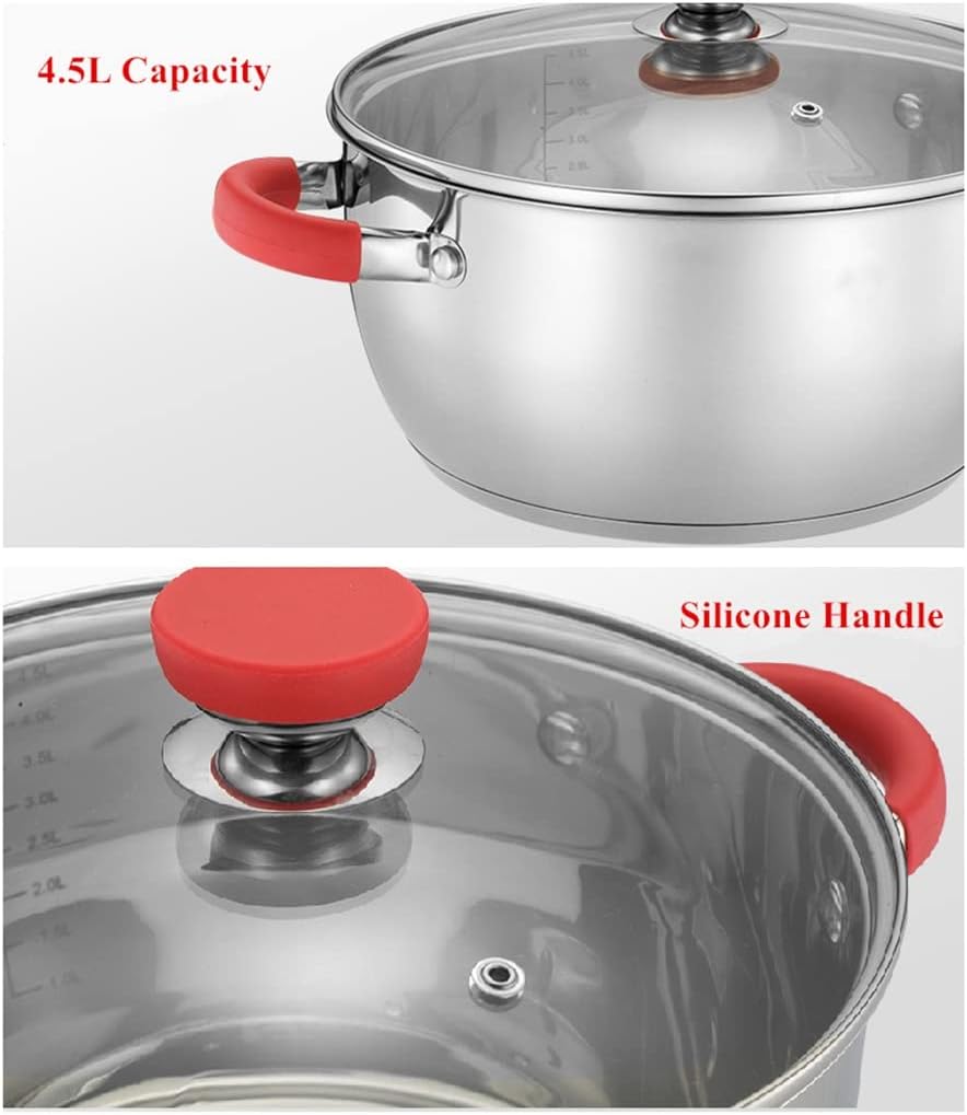 Feature: Made of stainless steel, mirror polished cooking surface is perfect for kitchen countertops and won't fade Practical engraved logo for easy measurement. Versatile Performance - Cookware Sets for All Kitchen and Stove Configurations Cover: Silicone tempered glass cover, Handle: Stainless steel handle, Silicone Easy to clean, does not hide dirt, r with clean water, wipe it off Material: 304 Stainless Steel Specification: 1x24cm casserole with glass lid 1x20cm glass lid casserole 1X24 cm frying pan 1x16cm milk jug with glass lid 1X24 cm steamer Package includes: 1 set of kitchen us and pans (other products not included) hint: Please allow slight deviation due to manual measurement. Due to differences between monitors, pictures may not reflect the actual colors of the item. Please refer to the actual product.
