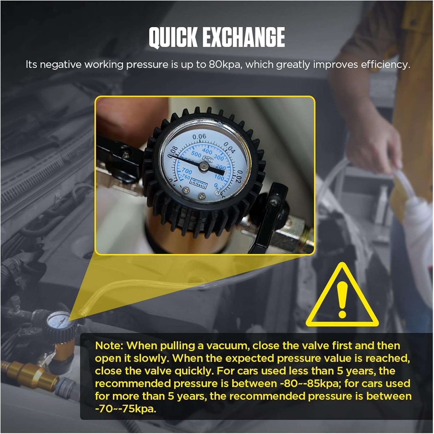 Cooling System Pressure Test Scope of application: mm ? 34 - 52 mm. Inlet Hose 1 meter. Outlet Hose 0.5 meter. MPA:-0.1 to 0. mmHg:-760 to 0. QUICK EXCHANGE : lt's negative working pressure is up to 80kpa, which greatly improves efficiency. Notice: When pulling a vacuum, close the valve first and then open it slowly.When the expected pressure value is reached, close the valve quickly. For cars used less than 5 years, the recommended pressure is between-80 ~-85kpa; for cars used for more than 5 years, the recommendedpressure is between -70 ~-75kpa.Three different specifications of adapterheads, can be selected accordingto the size of the coolant spout Packing List : A: Main Unit B: Male Coupler to shop air C: Adapters D: Inlet Hose E: Outlet Hose