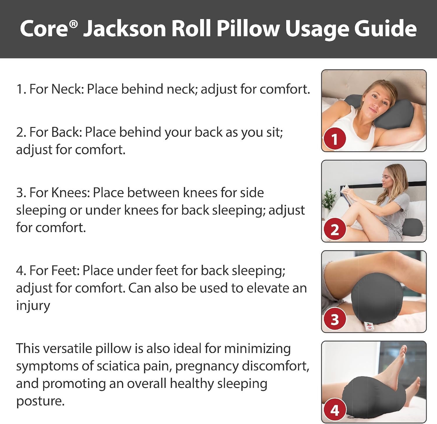 Bundle Includes: Core Products Jackson Roll Positioning Bolster, Gray (ROL-300-GR) & Slip-On Pillow Case, Blue (ACC-806) JACKSON ROLL Positioning Bolster - Find relief and support with the Core Products Jackson Roll Positioning Support Bolster Pillow - designed to promote proper spinal alignment and reduce pressure on the neck, back, hips, legs, and knees. Whether you're at home, in bed, or traveling, this bolster pillow offers targeted comfort to help ease lower back pain, leg discomfort, and sciatica symptoms. This fiber-filled leg pillow is ideal for positioning under or between the knees to relieve joint strain and maintain healthy sleep posture. It also serves as a neck roll pillow, lumbar support bolster, or multi-purpose positioning pillow while resting, reading, or sitting upright. Compact and travel-friendly, this bolster pillow for bed, fits easily into most suitcases, making it perfect for travel use. Use it behind your neck on a plane, in the car, or to elevate your legs and improve circulation. The durable cotton/polyester cover and high-resiliency fiber fill ensure long-lasting shape and comfort. SLIP-ON PILLOW CASE - help protect your pillow with this fitted blue case for the Core Jackson Roll. Protects and helps prolong the life of your pillow.
