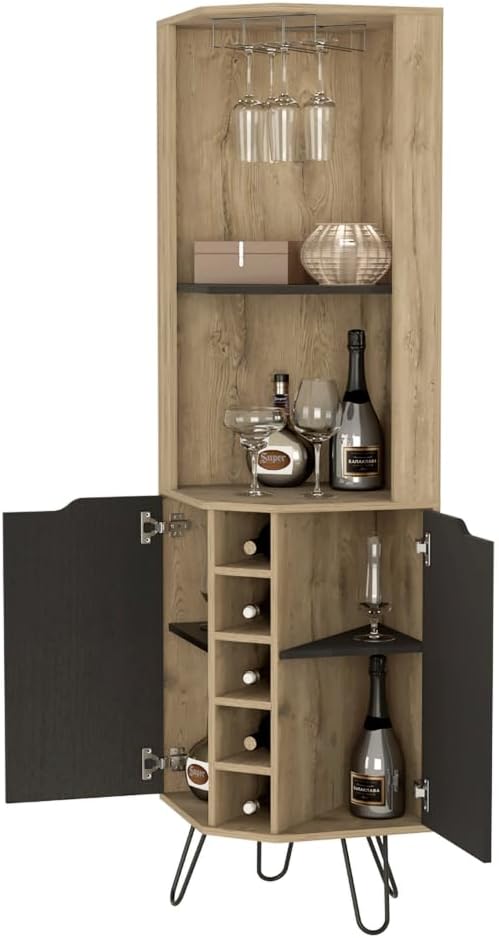 Leverkusen Corner Bar Cabinet is the perfect solution for anyone looking to add a bar to their home without taking up too much space! This cabinet has tons of storage space and a sleek and contemporary style that will look great in any room. It has two shelves (20,2''H X 15,7''H X 25''W) to expose your favorite drinks, one cup rack, especially for your glasses, and four shelves (8,4''W X 10,6''H X 13,3''H) with a door for more safety! Designed with elegant macadamia-Black manufactured wood finish. Dimensions: Height: 70,8" Width: 17,7” Depth: 17,7“.