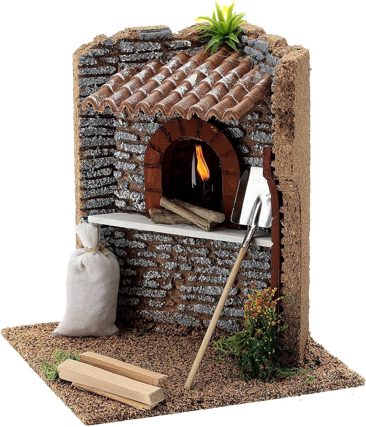 Miniature brick oven figurine with LED flame, 15x15x15 cm 10-12 cm nativity. This nativity accessory depicts a corner miniature brick oven with flame. Works with a 220V socket, adapted for 10-12 cm nativity sets. This item is part of a 3 part set: oven, fountain and windmill, item numbers: PR029018 - PR029020 - PR029022. Weight: 0.60 g - Article Size: Width: 14 cm|Height: 16 cm|Length: 14 cm - Article Materials: Wood, cork, electrical material - PRODUCT CODE: PR029018