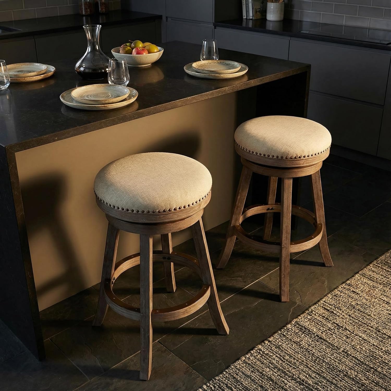 Rustic french country charm comes to life with these backless bar height stools. Weathered brown finish frame is accentuated with a neutral thick weave linen upholstery and high density foam cushion. Features a full-ring footrest protected with a metal kick plate that ensures the longevity and sturdiness of this stool. This sturdy bar stool is a beautiful country-modern addition to your bar and kitchen. Dimensions: 17"W x 17"L x 30"H