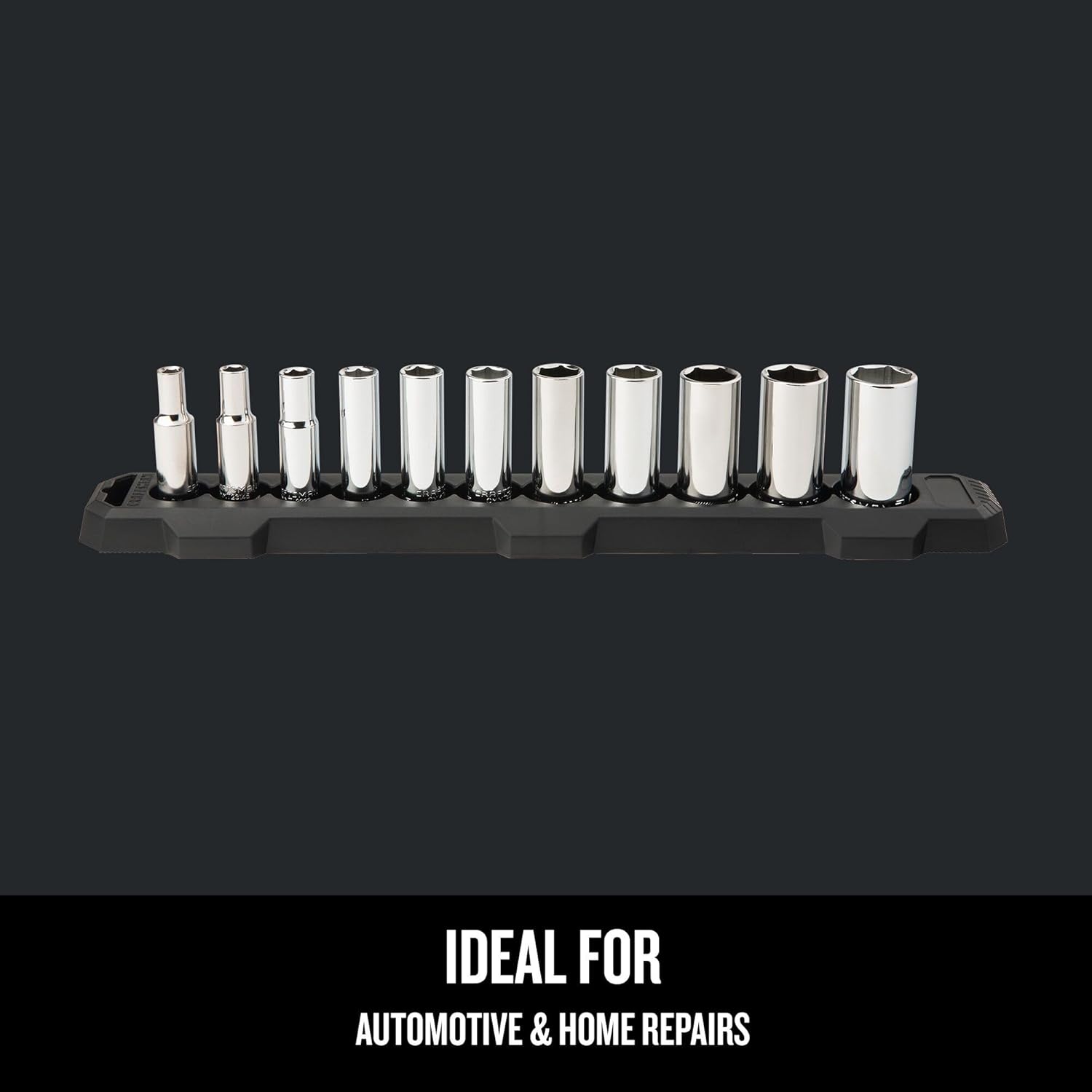 The 11-piece 3/8-inch Drive 6 Point Deep SAE Socket Set comes equipped with a broad assortment of sockets. This socket set 3/8 drive is perfect for automotive repair, general construction, and DIY repairs.