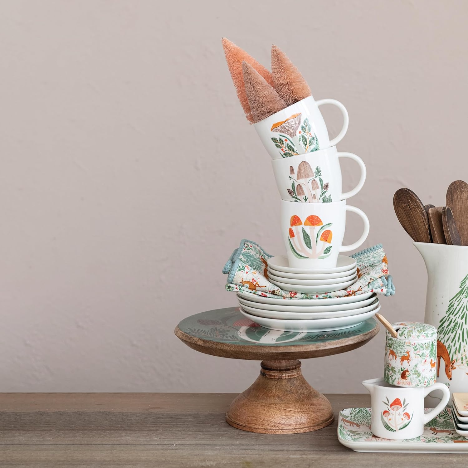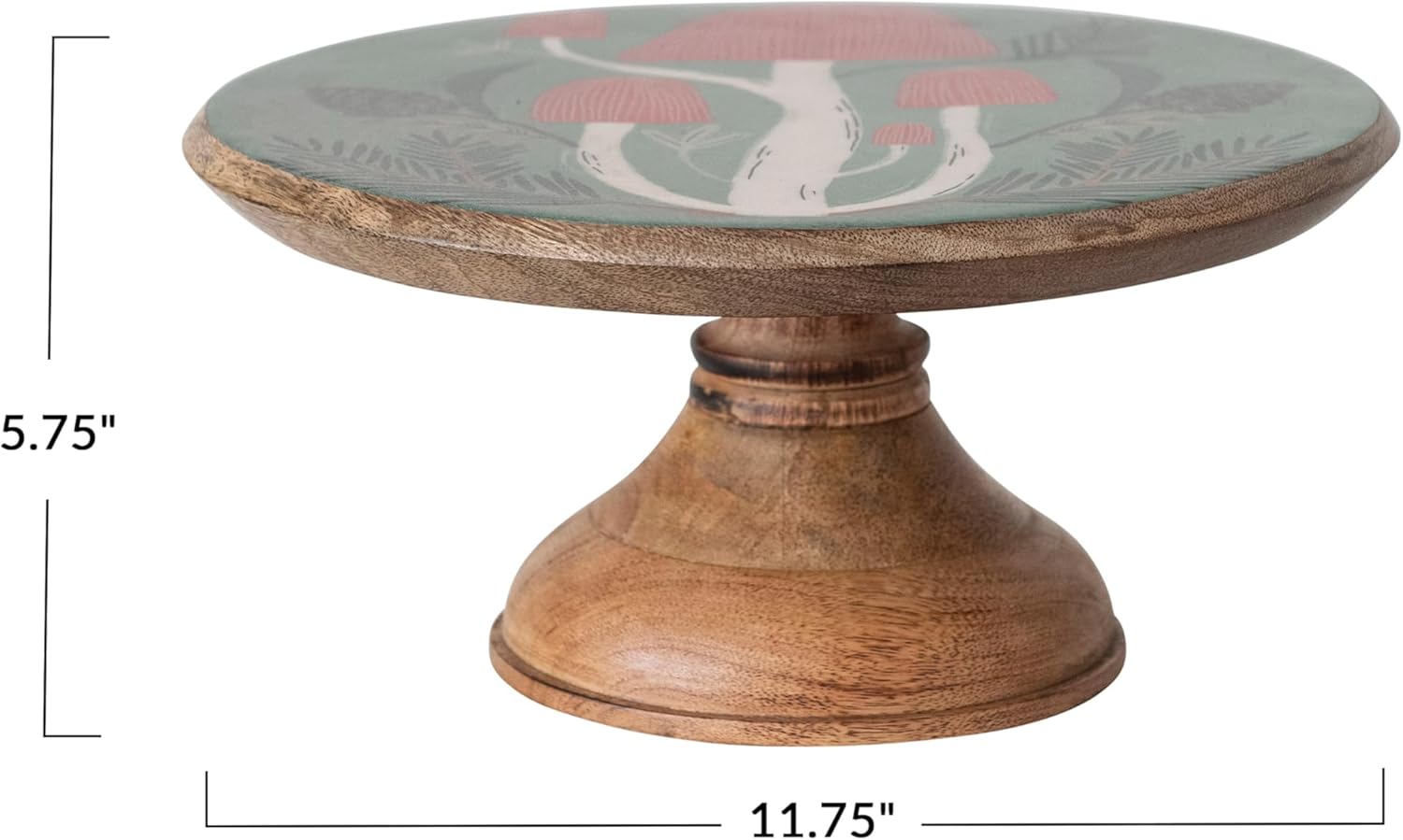 This 11.75-inch round enameled mango wood pedestal stands at 5.75 inches high and is adorned with a charming array of mushrooms in a natural, green, and red palette. The food-safe enamel ensures it's ready for any occasion, while the hand-wash recommendation will keep it looking as magical as the day. Whether used for serving signature dishes or as a decorative piece, this pedestal will add a whimsical and earthy touch to the home. Each one is unique, with variations that make it a special addition to any collection. The sturdy construction of this pedestal makes it ideal for displaying cakes, pastries, or even a collection of candles.