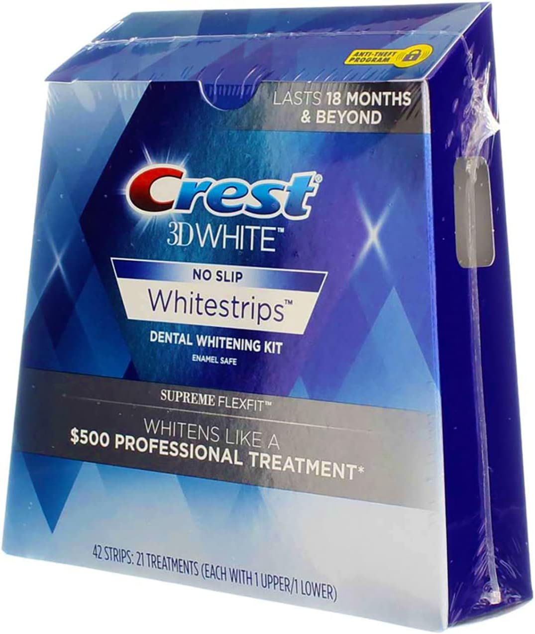 Want to your whiten teeth at home? Try Crest 3DWhitestrips Supreme Bright. This teeth whitening treatment provides professional-level whitening that removes over 25 years of stains, with a comfortable, no-slip whitening experience. The Advanced Seal Technology's no-slip grip means the strips stay put until you take them off, allowing you to talk and even drink water while whitening your teeth. Using our highest level of hydrogen peroxide whitening ingredient, this enamel-safe, at-home teeth whitening kit will make your teeth whiter to get a 100% noticeably whiter smile, guaranteed.