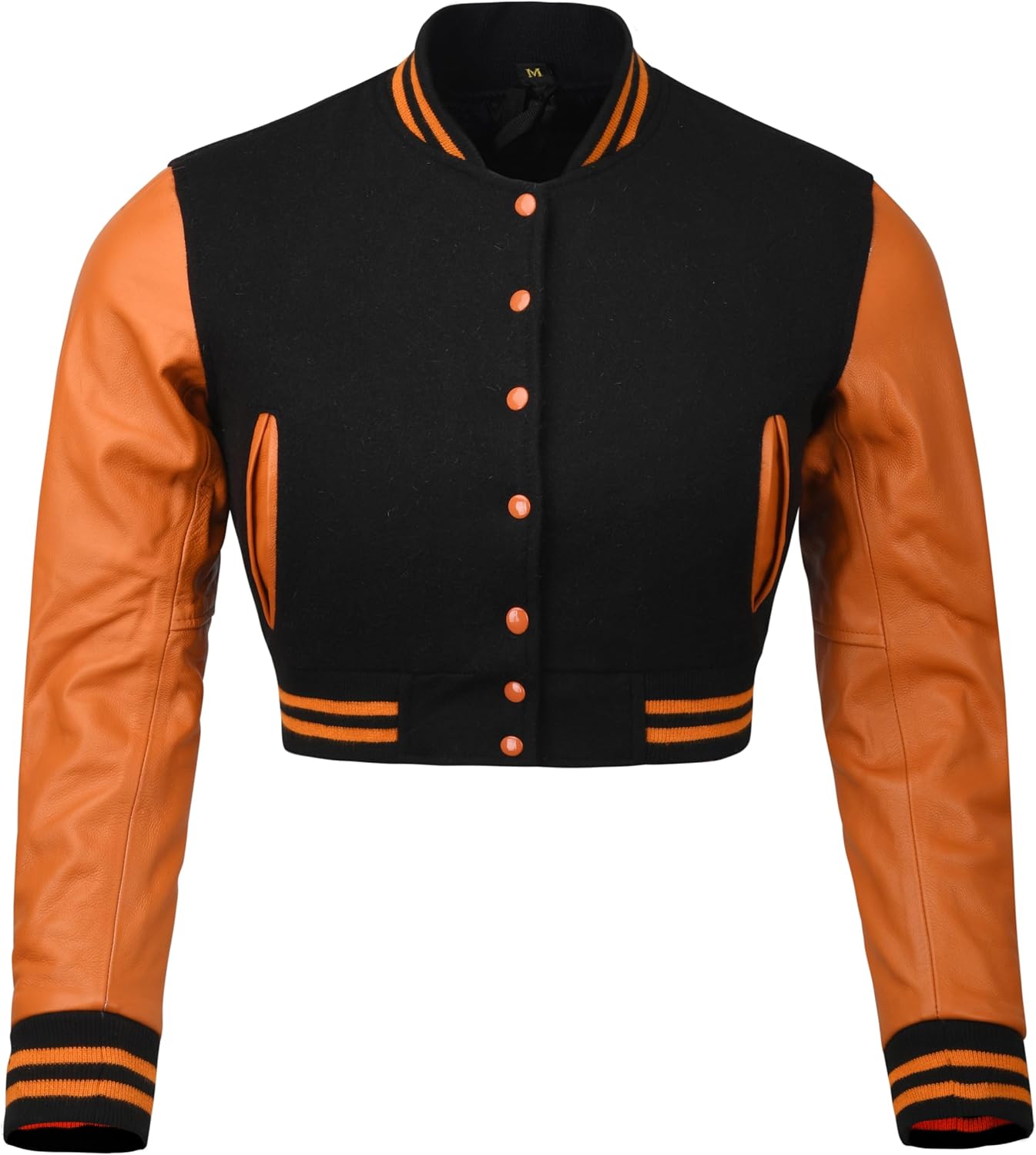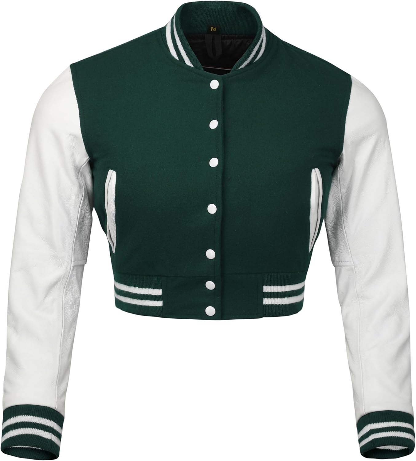 Cropped Varsity Jacket Women - Premium Quality Leather and Wool Baseball Letterman Jacket for Women's, Long Sleeve
