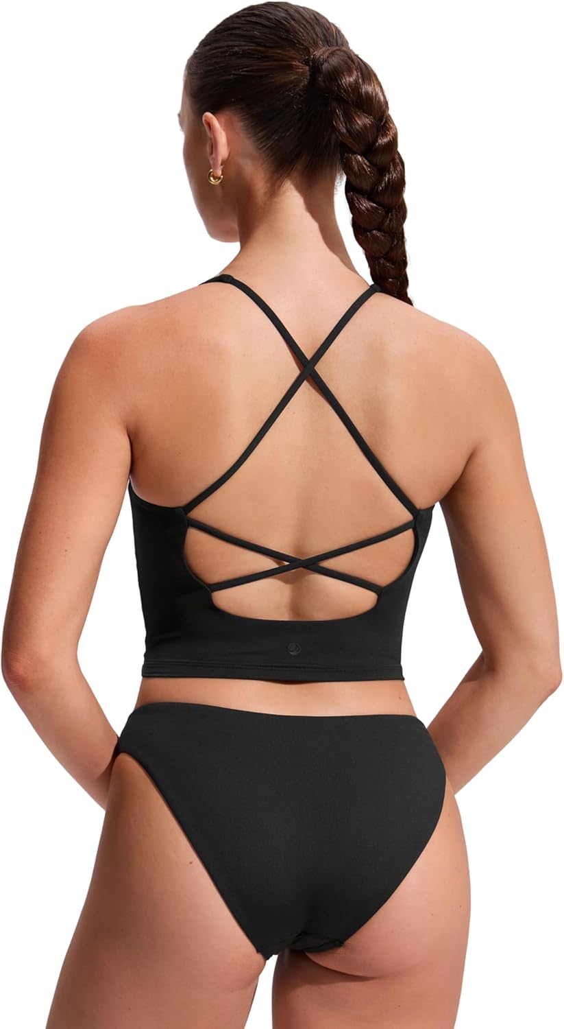 CRZ YOGA Women's tankini top, the fabric is smooth, breathable and quick-dry, bringing you a comfortable sports experience. V neck delivers a sexy figure. Crisscross strappy design outlines your flattering back curve.Feature & Fitting: Designed for swim. Crop Length V neck Criss Cross Back Built-in removable padded Fabric: Quick drying, sweat wicking, breathable 4-Way stretch Supportive, enough compression 78% Polyamide, 22% Elastane
