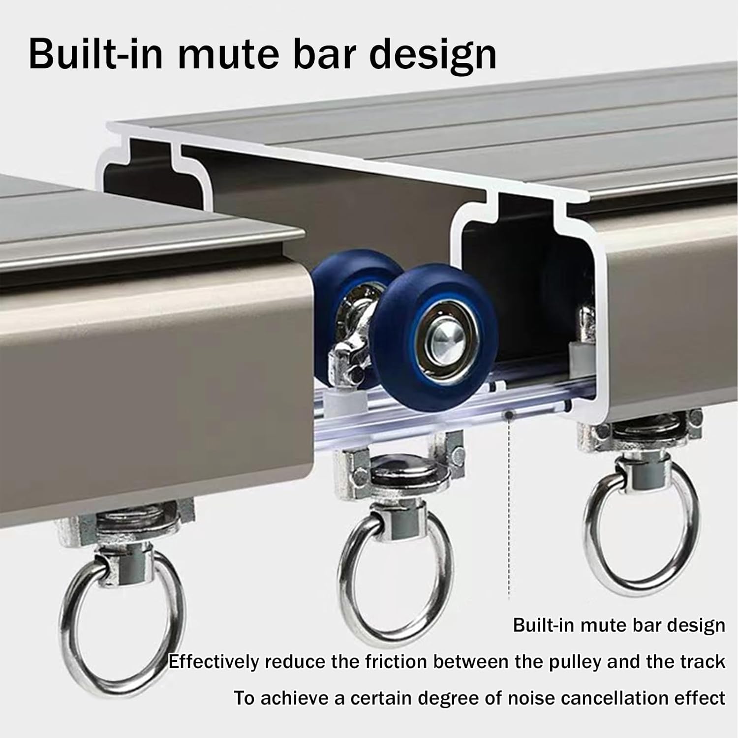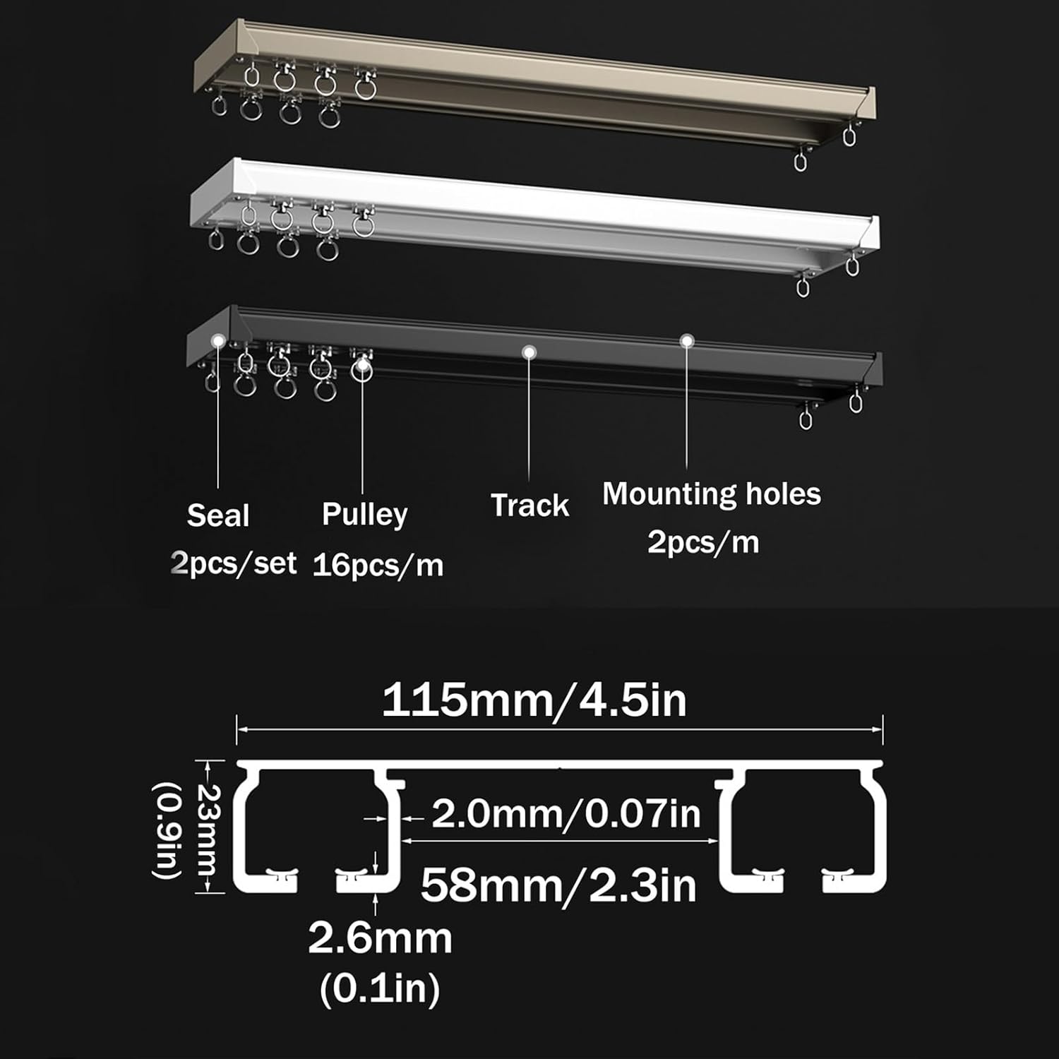 Packaging: The curtain rail kit contains the items needed to install the rails. When it is time to cut the curtain rails for shipment, the curtain rails are cut into sections for transportation. You can rest assured that we will send you aluminum alloy connectors that connect easily, connect tightly, and the pulleys run smoothly without any obstacles. Curtain rails are easy to install. Easily mounts to windows.When the transportation limit is exceeded, the shipment needs to be cut off. Special connectors are distributed and do not affect use.Connector instructions1. Insert the delivered connector2. Connect to another track3. Connect tightly and tighten the screws4. The connection is seamless and the pulley passes smoothly2.6mm extra thick bearing pulley silent track conjoined double row rail straight rail guide rail curtain track double railThe curtain slide rails are smooth and unobstructed, and are also equipped with silent rollers, perfect sound insulation, and perfectly integrated with the windows, making the opening and closing of the curtains very quiet, and our ceiling curtain track shower curtain track will not affect your sleep. Make your curtains look better at the same time.Product name: Heavy duty double row trackType: straight railColor: champagne, white, blackMaterial: aluminumSide thickness: 2.0mm, bottom thickness: 2.6mmSealing: alloy materialPulley: Bearing wheelAdvantages: Aluminum alloy material, no impurities, stainless steel color matching alloy seal, will not age, heavy-duty large square rail, thickness 2.6mm, unique track groove design, built-in double silent strips, super smooth, super silent, very easy to slide, alloy Ball/bearing wheel has stronger support capacity than plastic ballsIncludes accessoriesNumber of pulleys: 16/meterSuspension method: hook typeNumber of seals: 2 pieces/setInstallation method: top installation