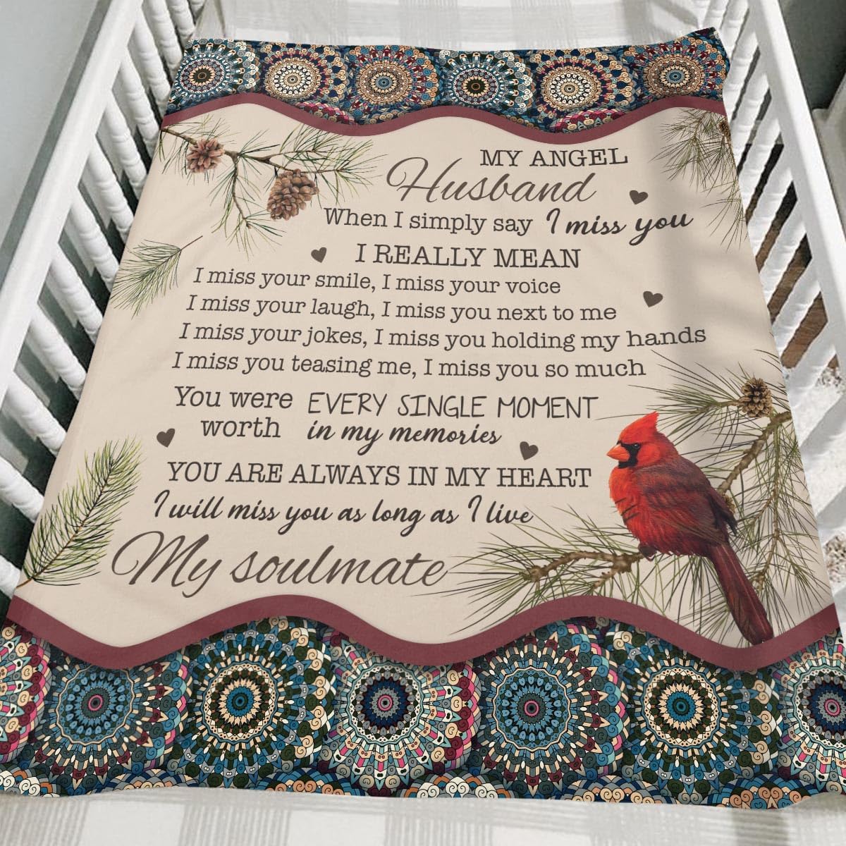 Wrap yourself in love and cherished memories with our Personalized Memorial Fleece Blanket. Designed with the heartfelt poem “My Angel Husband”, delicate pine branches, and a vibrant red cardinal – a symbol of everlasting love and remembrance – this blanket offers both warmth and emotional comfort. Crafted from ultra-soft 100% polyester microfleece, it’s perfect for snuggling on the sofa, using as a bed throw, or displaying as a tribute piece in your home. The advanced printing ensures the text and artwork remain vivid, crisp, and fade-resistant over time. Available in four sizes – 30x40", 40x50", 50x60", and 60x80" – this blanket makes a thoughtful sympathy gift for yourself or someone grieving the loss of a husband. Easy to care for, it’s machine washable, quick-drying, and built to last.