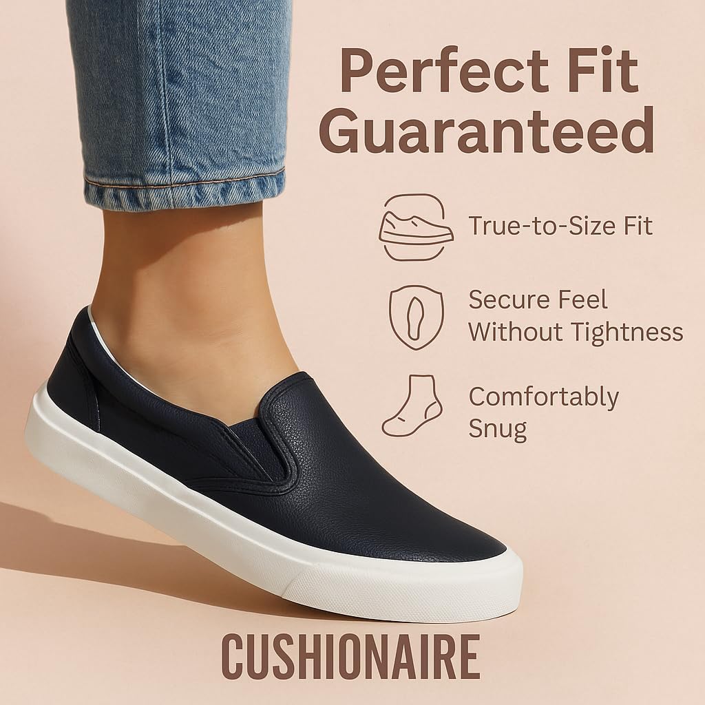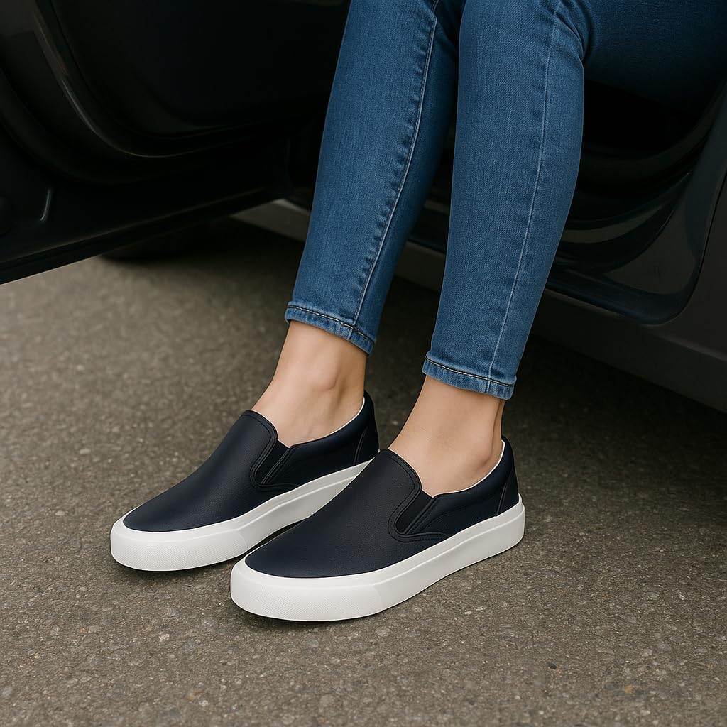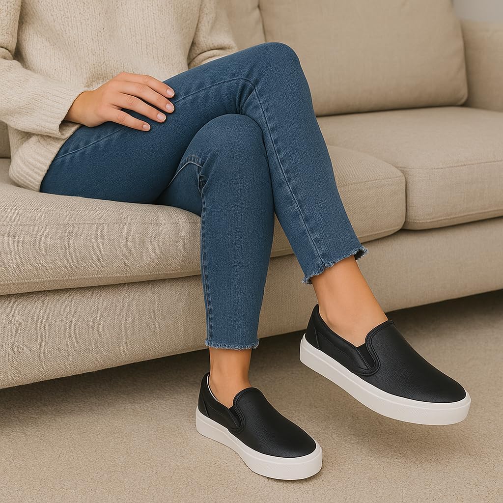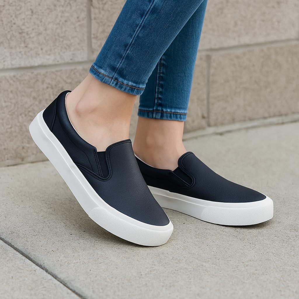 Elevate your everyday wardrobe with these effortlessly stylish and endlessly versatile sneakers for women. Designed to blend comfort, fashion, and function, these womens sneakers are your go-to pair for all-day wear—whether you're running errands, meeting friends, or heading to the office. With a clean, contemporary silhouette, these slip on sneakers women love offer a fuss-free laceless design that slides on with ease and hugs your feet for a secure fit. Crafted from premium white vegan leather, these slip on sneakers add a touch of modern sophistication while staying lightweight and breathable. The soft yet durable upper contours to your foot, offering flexibility without sacrificing structure. Whether you're pairing them with jeans, leggings, or dresses, these womens shoes provide a polished look with an effortlessly casual vibe. Inside, a cushioned insole delivers plush, responsive comfort that supports your stride from morning to night. The lightweight, flexible sole ensures a natural range of motion with every step, making these the perfect shoes for women who demand style without compromising on comfort. From long commutes to weekend walks, these sneakers keep up with your pace—offering support, comfort, and breathable performance every step of the way. Looking for neutral essentials or standout staples? These black laceless shoes add sleek edge to your closet, while the white vegan leather slip on sneakers lend a clean, fresh finish to your look. Whether you're dressing up for casual Fridays or dressing down for weekend strolls, these womens sneakers transition seamlessly from day to night. With their timeless shape, elevated materials, and foot-friendly construction, these shoes for women are a wardrobe staple built for movement, made to last, and designed to keep up with your lifestyle. Rediscover everyday style and comfort in one step—these are the slip on sneakers women never knew they needed but won’t want to live without.