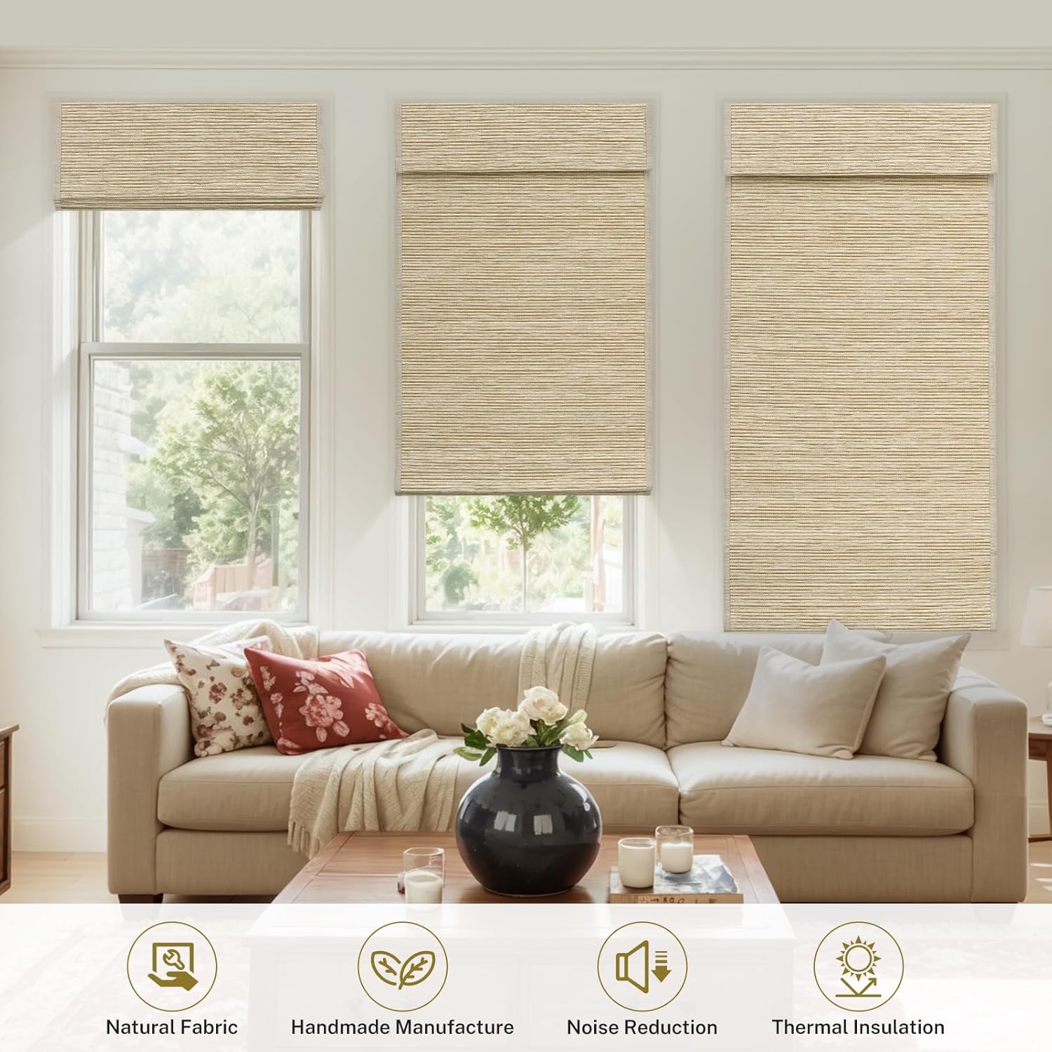 Moonice Roman Shades for Windows- are amongst the most popular & modern window coverings. Roman Roller Shades Best for: Roman Shades for Windows Blinds for bedroom windows : Protecting Privacy,Noise reduction Let you have a comfortable and secure sleep environment. Living room and Kitchen Shades blinds: 100% natural and well-chosen natural fiber material, which is made of hemp, Jute, bamboo, grass and create soothing atmosphere. Natural texure is beautiful and eco-friendly to any space. CUSTOM Roman Shade : Click “Custom Size” to tailor your shade to your preferences by selecting from three key elements: fabric type, lining option, and edge binding. Living Room Shades: Can effectively reduce outdoor noise interference,reading and learning more comfortable and efficient. Roman Shades for windows Cordless window shades creates a safer environment for homes with children and pets. It provides a clean,tangle-free look to the window. shades for indoor windows: Quickly complete the installation - get rid of the cumbersome installation method Roman Shades for Home Embrace the inherent beauty of nature's imperfections and meticulous craftsmanship, as each cordless shade becomes a distinct work of art..Crafted meticulously by skilled artisans, these shades bring an organic warmth to any room. Blinds Cordless Roman Shades for Windows Cordless operating system, easy to lift, smooth operation Simple color, suitable for various home decoration styles Mounting hardware and installation instruction are included A quick and easy installation process