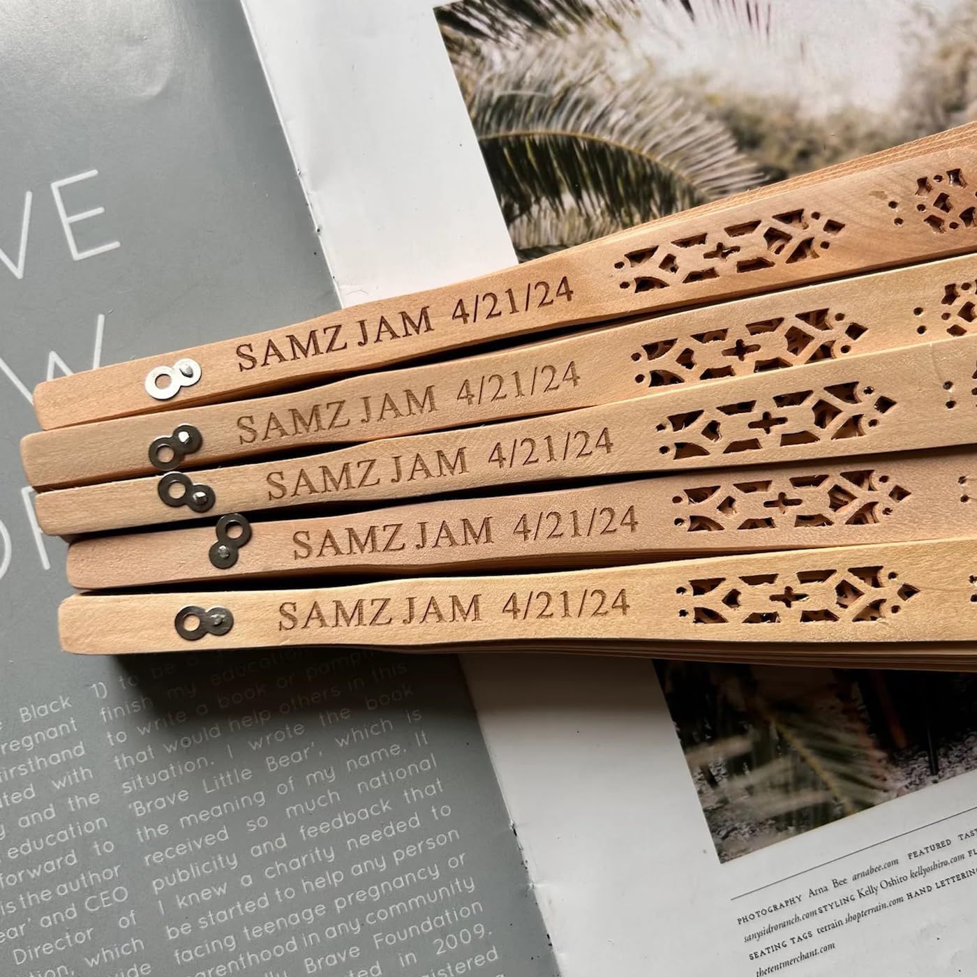 Material Size: Length 20.5cm, Width 33cm Packaging: 20pcs/30pcs/40pcs/50pcs/60pcs/100pcs in white organza bag. We can also engrave names and dates MATERIAL: WOOD These fans are made from wood and woven fabric, this hardwood has a natural scent and is ideal for making fans. Colour: Natural wood colour. Fans are made from natural wood and usually have colour variations. It is normal for the same fan to show different colours. Good wood aroma. Wooden folding fans have a light, pleasant fragrance that is not too strong for sensitive noses. Practical and artistic: This is a handicraft with a vintage character. This vintage style fan not only represents elegant classical beauty, but also brings you coolness in summer and decorates your home and office. These fans will bring you a fresh and elegant feeling. WIDE APPLICATION: Wooden folding fans are suitable for home, office, teahouse and stage, also can be used as gifts for your family or friends, also can be used as party favours in weddings, birthdays, baby christening, bridal shower, graduation or any outdoor or indoor events, add chic atmosphere to the party, your guests will surely love it.