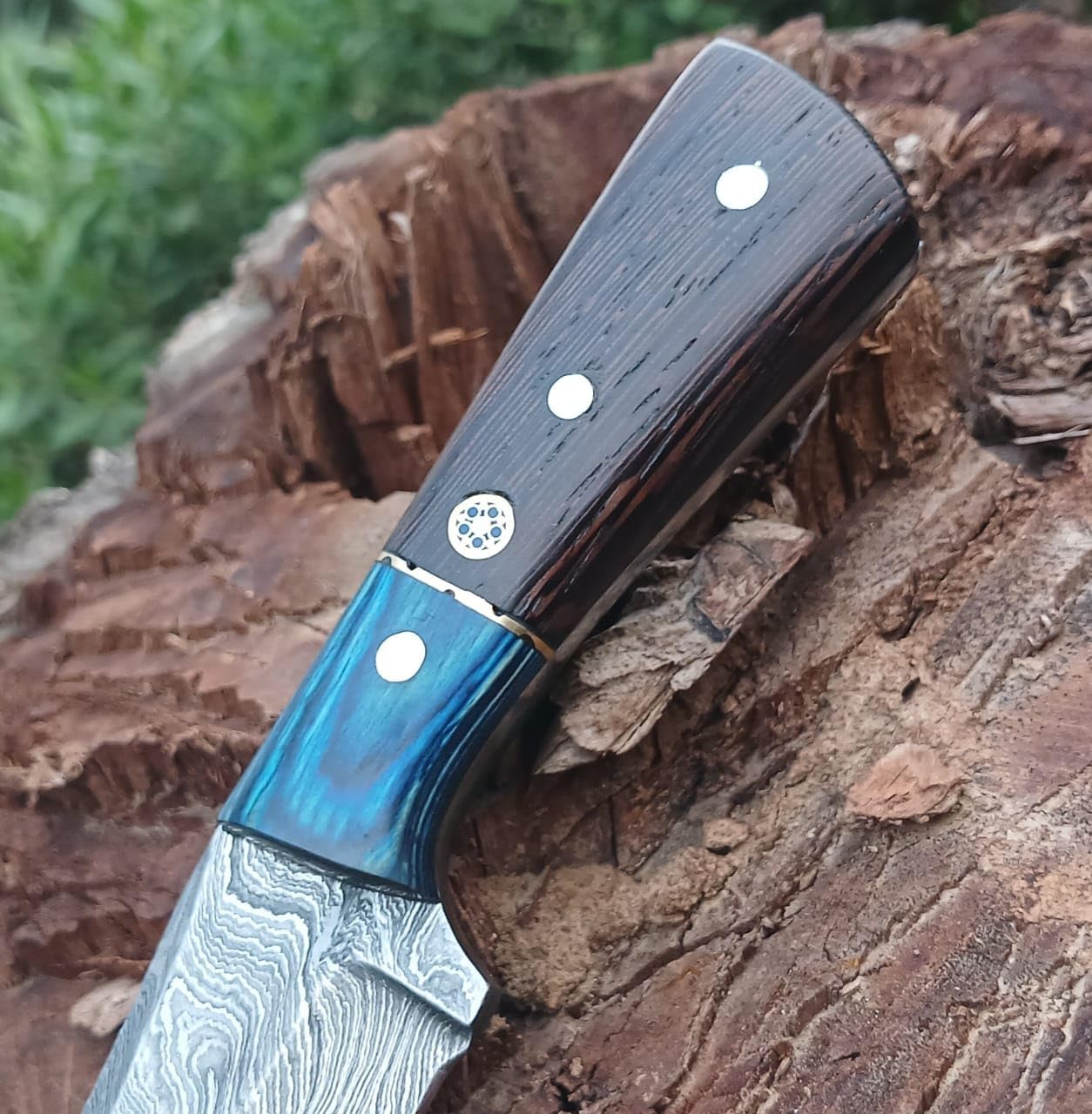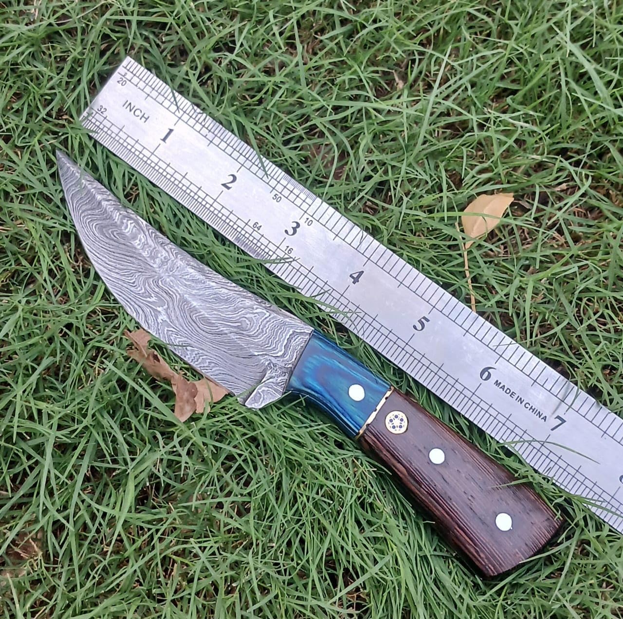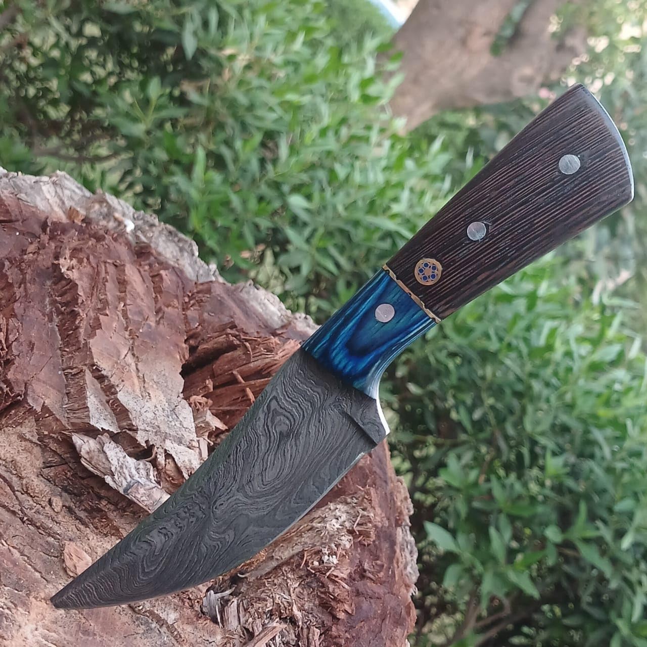 Crafted with the utmost attention to detail, this custom handmade Damascus steel hunting knife is a true masterpiece. The fixed blade, expertly forged from layers of folded and hammered steel, boasts a stunning pattern that is both visually striking and incredibly durable. Whether you're an avid hunter, a camping enthusiast, or simply appreciate the art of fine craftsmanship, this skinner knife is sure to impress. The handle, meticulously carved from premium wenge wood and densified wood, provides a comfortable and secure grip, ensuring optimal control and precision. With its razor-sharp edge and robust construction, this knife is built to withstand the toughest outdoor adventures. Lightweight yet incredibly strong, it's the perfect companion for skinning and dressing game, as well as tackling various camping tasks. Embrace the beauty of handcrafted excellence and elevate your outdoor experience with this remarkable Damascus steel hunting knife.