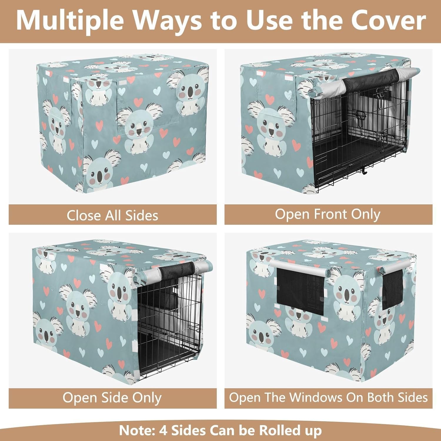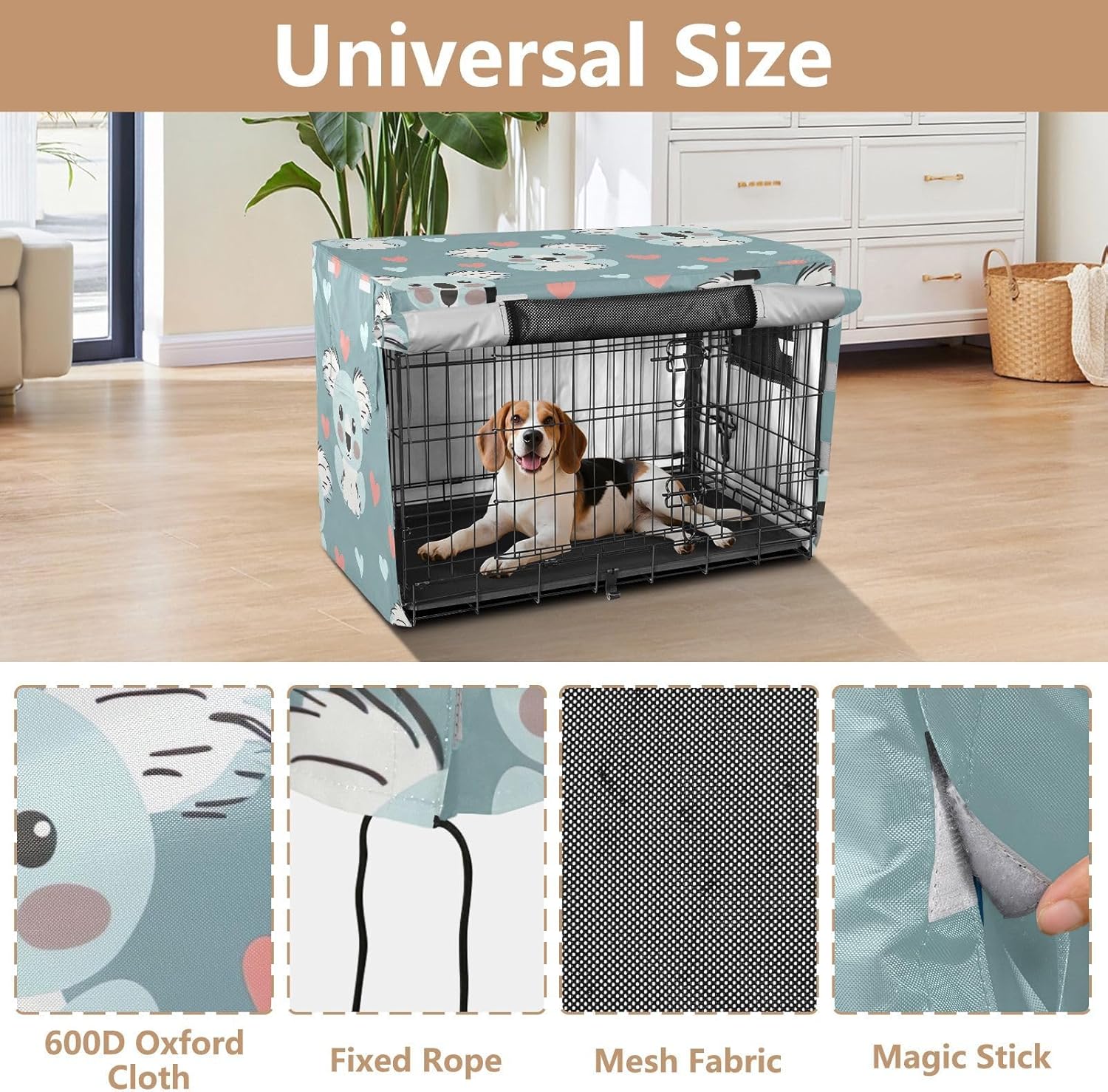 Protection – Made from 600D silver-coated oxford fabric, this pet crate cover provides reliable protection against weather conditions, including wind and rain. It prevents your dog from scratching the crate and blocks harmful UV rays.Easy Installation – This dog crate cover features a user-friendly fastening system, allowing for quick installation without tools. It securely attaches to your dog crate, ensuring it stays in place for continuous protection.Effective Ventilation – Mesh windows on every side of the crate cover allow for steady airflow, keeping your dog comfortable and well-ventilated while inside. This design ensures your pet has a cool and breathable environment.Secure Fit – Equipped with four tie-down straps, the cover stays firmly in place, preventing it from shifting or being blown away. This added stability makes it suitable for outdoor use even in windy conditions.Ideal for Multiple Uses – This versatile indoor dog crate cover is Ideal for both indoor and travel use. Whether you’re at home, on a road trip, or camping, it offers a practical solution for protecting your pet’s crate.