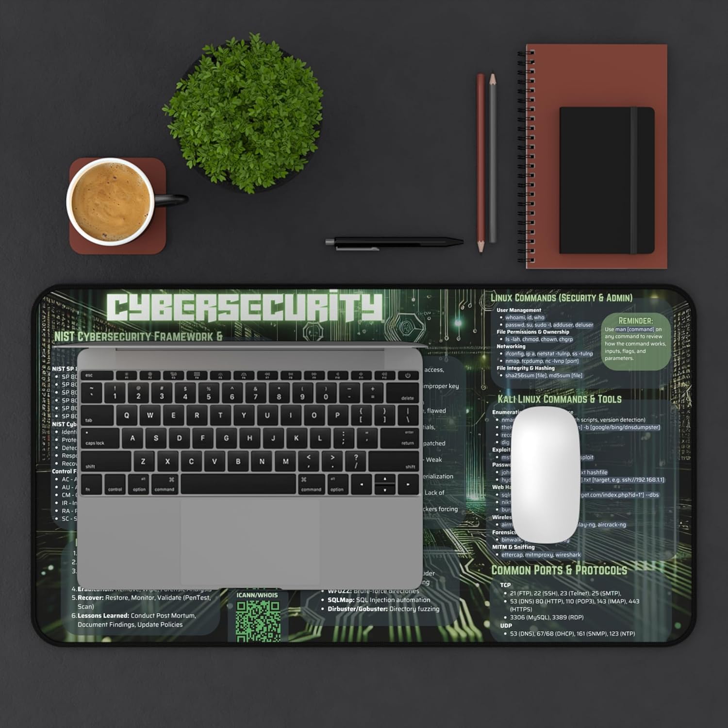 Elevate your workspace with this Cybersecurity Deskmat, designed for ethical hackers, penetration testers, sysadmins, and cybersecurity enthusiasts. Featuring essential cybersecurity references, this high-quality mouse pad is both functional and visually striking. Crafted with quality and designed to meet your needs, this product brings convenience and reliability to your everyday life. ๐ŸŽ Great gift for IT professionals, cybersecurity students, and hackers!