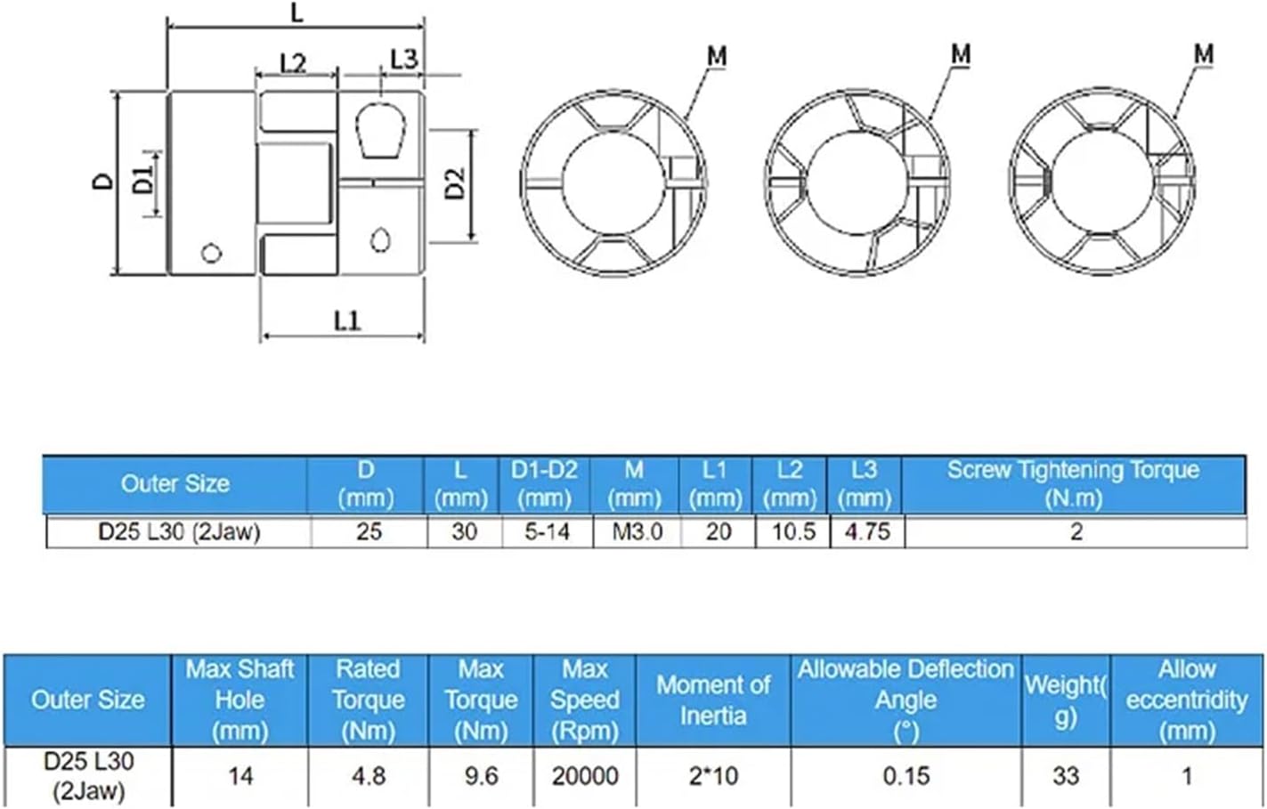 CouplingsCommon CouplingsDIFFERENT PLUM COUPLING1PCS D25 L30 2 Jaws Plum Coupling1. High speed2. High temperature resistance3. High-precision4. Low noise5. Wear-resisting6. Long Service LifeHigh Strength ScrewAluminum Alloy MaterialInner HolePlum Blossom PadOuter SizeD(mm)L(mm)D1-D2(mm)M(mm)L1(mm)L2(mm)L3(mm)Screw Tightening (N.m)D20 L25 (2Jaw)20254-10M3.016.58.84 1 D20 L30 (2Jaw)20304-10M3.0198.85 1 D25 L30 (2Jaw)25305-14M3.02010.54.752 D25 L35 (2Jaw)25355-14M3.022.5116 2 D30 L35 (2/3 Jaw)30356-16M4.022.5115.52.5D30 L40 (2/3 Jaw)30406-16M4.025116.752.5D35 L50 (3 Jaw)35508-20M4.030.5137 3 D35 L60 (3 Jaw)35608-20M4.030.5137 3 D40 L50 (3 Jaw)40508-22M5.031158.754 D40 L55 (3 Jaw)40558-22M5.033.5157 4 D40 L66 (3 Jaw)40668-22M5.039158 4 D40 L78 (3 Jaw)40788-22M5.045158.754 D45 L66 (3 Jaw)456610-25M5.039.5168 4 D45 L78 (3 Jaw)457810-25M5.045.5168 4 D55 L66 (4 Jaw)556610-30M6.04016108 D55 L78 (4 Jaw)557810-30M6.04616108 D65 L90 (4 Jaw)659012-38M8.052.518.810.516D80 L115 (4 Jaw)8011514-45M8.066.5221316D95 L126 (4 Jaw)9512616-55M10.073241440D1