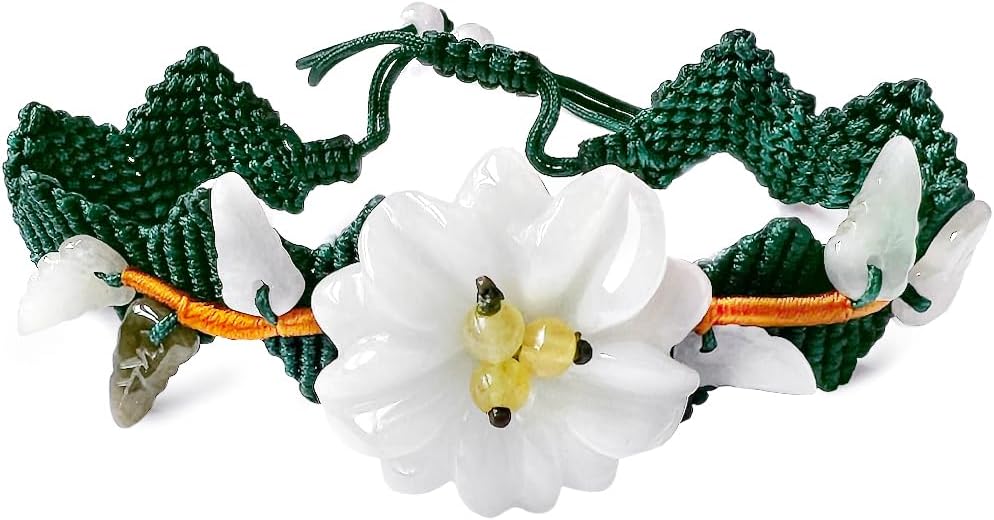 3 Beads Yellow Jade: Three round 12mm yellow jade beads are set on a jade bead cluster ball hand-knotted cord bracelet.Dragonfly: Hand-carved Grade A jadeite jade dragonfly set on jade beaded cord bracelet. The dragonfly measure about 1 by 0.75 inches.Vintage Flower: Six hand-carved Grade A jadeite jade flower set like a band on a hand knotted bracelet giving it a vintage look. The 6 jade flowers measure 19mm in diameter.Daisy Flower: A single beautiful hand carved white/green Grade A jadeite jade daisy (25-30mm) with a red jade center sits between several strands of irregularly placed tiny red and white/green jade beads held together by black cord.Strength Bracelet: This symbolically strong bracelet is both simple yet unusual. Each rectangular piece of greenish white Grade A jadeite jade is held together by a strong gold silk cord.Daisy Pink: Pretty, unusual and stylish, this Grade A jadeite jade daisy with warm pink silk cord and hand carved daisy measures 25-30mm across.Elegant Flower: A single beautiful hand carved Grade A jadeite jade elegant flower with a cluster beads center. The flower is approximately 20-23mm in diameter.Star Flower: A hand carved Grade A jadeite jade star flower set with jade beads on a hand knotted green gold adjustable green cord bracelet.Daisy Green: A hand carved genuine Grade A jadeite jade daisy set with 6 jade beads on a green adjustable green cord bracelet. The flower is about 25mm in diameter.Orion's Belt Flower: A finely crafted hand woven cord attached with 2 small delicate carved jade flowers on each side of a larger carved jade flower.Adorning Heart: This multi-colored decorative jade heart bracelet consists of multiple color hand-woven cords decorated with round and rectangular beads.