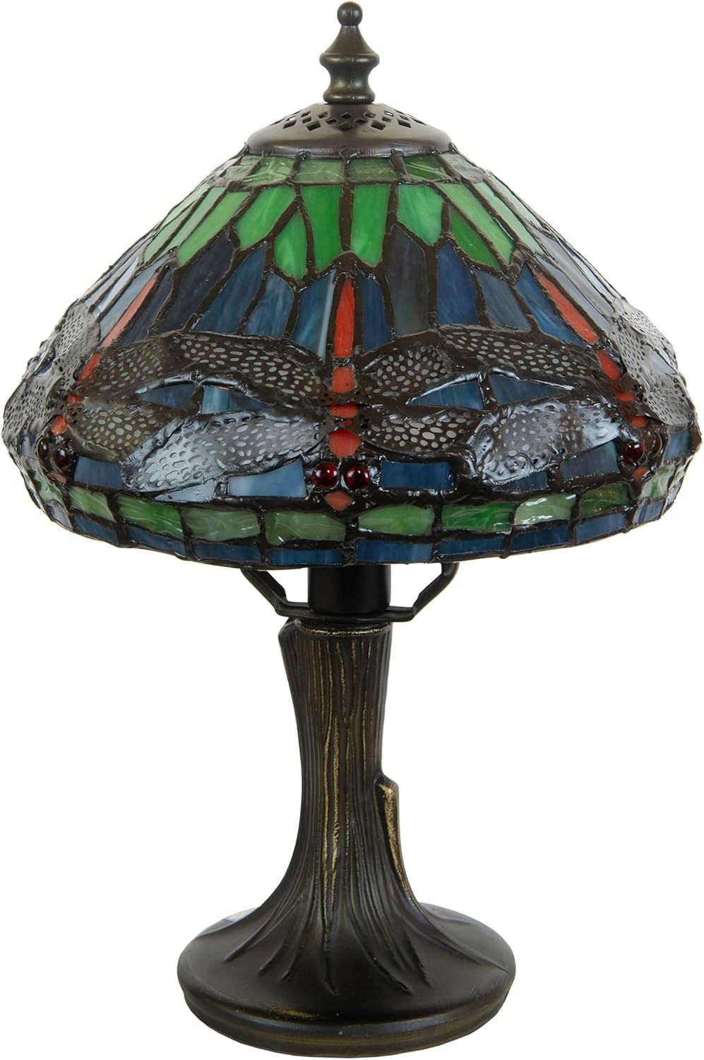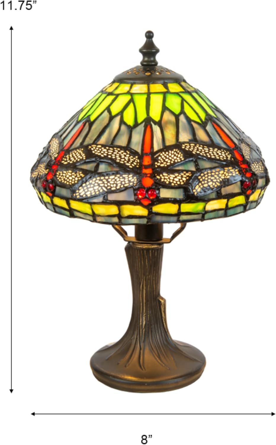 Product Description A miniature version of the iconic Tiffany dragonfly lamp, this delightful lamp may be short in stature, but it is long on design elements. Like its famous big brother, 217 pieces of art glass are hand rolled and copper foiled in Tiffany`s time honored tradition. Beautifully filigreed dragonflies rim the bottom of the shade, which is ablaze in vibrant shades of blue, green, red, yellow, purple and amber. The metal base is tree trunk style, and is finished in antique brass. Perfect for any room in your home or office where you want that extra splash of color, this delightful little lamp is the perfect way to begin your Tiffany collection. 8`` W x 11`` H. Shade 8`` diameter. 1 x 60W candelabra. From the Manufacturer The Dale Tiffany Collection is the world's foremost collection of fine Art Glass Lighting and Home Accents. Dale Tiffany employs only the highest quality hand-rolled art glass and the same high quality copper foil and hand leading technique originally developed by Louis Comfort Tiffany more than 100 years ago. Renowned for their quality workmanship and impeccable attention to detail, Dale Tiffany has recaptured the artistry and craftsmanship perfected by L.C. Tiffany in his original creations. Since every Dale Tiffany piece is individually crafted, no two are exactly alike and each becomes its own truly unique heirloom piece. Traditionally elegant, classically styled, and made to the highest quality standards, Dale Tiffany lighting and home accents are sure to enrich, enliven, and add unique character to any room.
