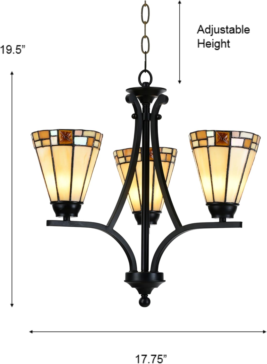 Sleek and contemporary, our Sundance 3 light LED hanging fixture easily accentuates any décor style, from vintage to modern. A trio of up lit shades feature a background of wedge shaped light amber glass panels that are separated by deep filigree. Sundance's upper edge is a double row of glass squares in varying shades of amber and white, set in a mosaic pattern. Warm amber glass gems have been placed throughout the design to add texture and extra sparkle when the lamp is lit. Sundance has been fitted with a 7.5W dimmable LED module, designed to provide maximum light output with minimum power usage and eliminates the need for bulb changes over the life of the fixture. Our warm and inviting Sundance 3 light hanging fixture features a trio of matching up lit shades. Each shade sits atop a curved arm on the metal frame, which is finished in Tiffany Bronze. The fixture hangs from a metal canopy and chain and is a perfect choice over a casual eating area or in a foyer with high ceilings.