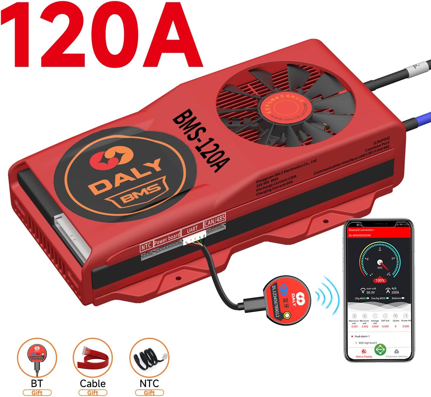 This is DALY smart bms Rated 3.2V with smart communication function (CAN) and Cooling Fan Battery pack strings must be matched with BMS strings. DALY BMS Adopt top quality (A-level) IC Solution make battery management much more efficient , greatly help to keep battery pack healthy and stable. Extending battery life-span, improve performance. DALY BMS being waterproof test, humidity resistance . DALY BMS can be applied with home power storage system , RV Power supply , E-bike and other lithium battery related device . Factory Default Setting Over Charge detect voltage: 3.75±0.05 Over Charge release voltage: 3.65±0.05 Over Charge protection delay 1s Balance detect Voltage: 3.2V Balance Current: 30±5 mA Over discharge voltage detect :2.2±0.1 V(The over-discharge protection voltage can be reset in certain range by bluetooth app if you need it) Over Discharge Detect delay 1s Over discharge voltage release voltage: 2.3±0.1 V BMS Self-Consumption Working Current :≤20 ma Fan Runs at about 50° If you have any questions, please leave us a message. We are happy to assist you and are willing to offer a 100% satisfactory shopping experience.
