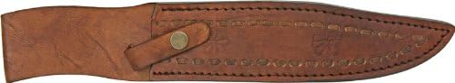13 7/8" overall. 8 5/8" Damascus steel bowie blade. Round design stag handle with brass guard and pommel. Brown leather belt sheath.