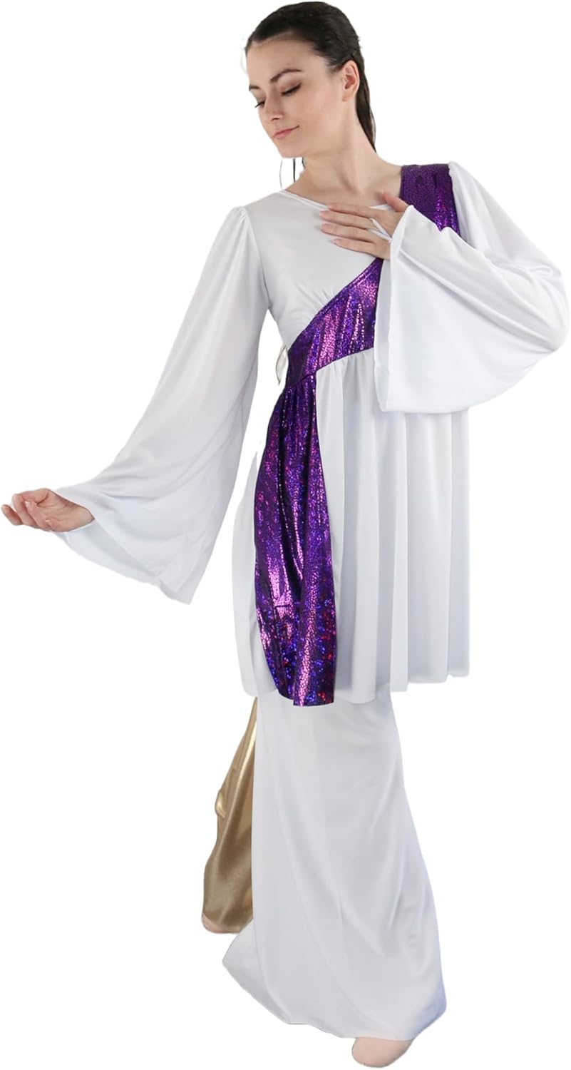 This Shimmery Asymmetrical Bell Sleeve Praise Dance Tunic features a unique loose bell long sleeve, giving you enough space to move and giving you the best comfort when dancing. A loose skirt and metallic color block patchwork design will dance with each movement, creating a vibrant, unique, and stunning look. Perfect for liturgical dance, worship dance, ministry dance, modern dance, and any performance.