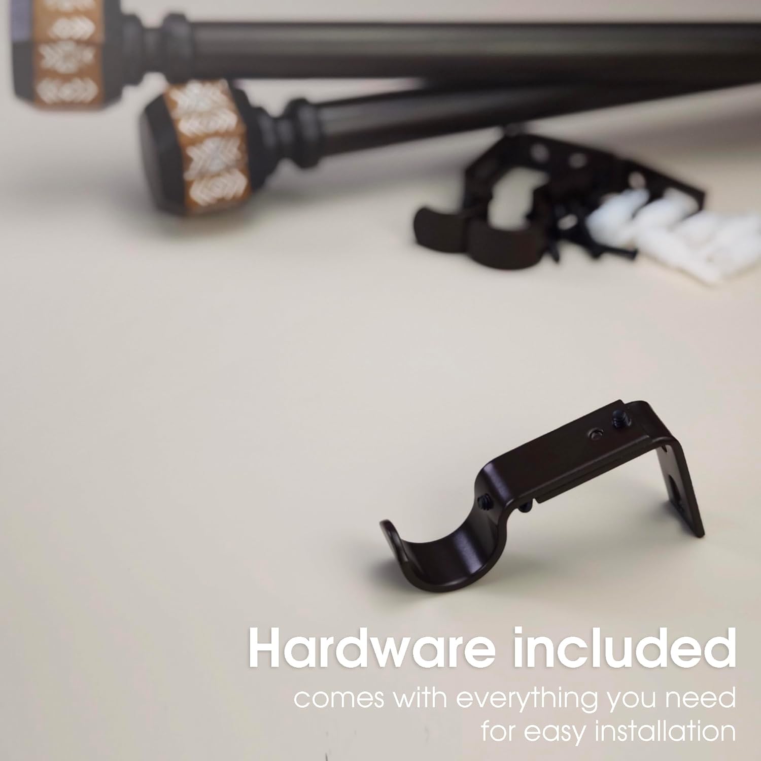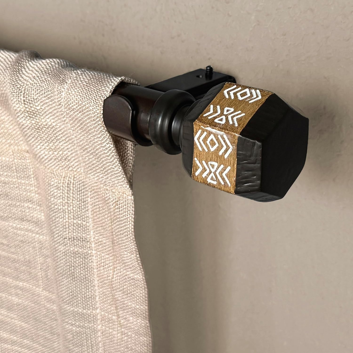 SKYPLUS LIVING Dark Bronze Curtain Rod Set with Faux Wood Geo Pattern Carved Finial,Standard Single Drapery Rod for 1 Pack, 1 inch diameter, Adjustable Length