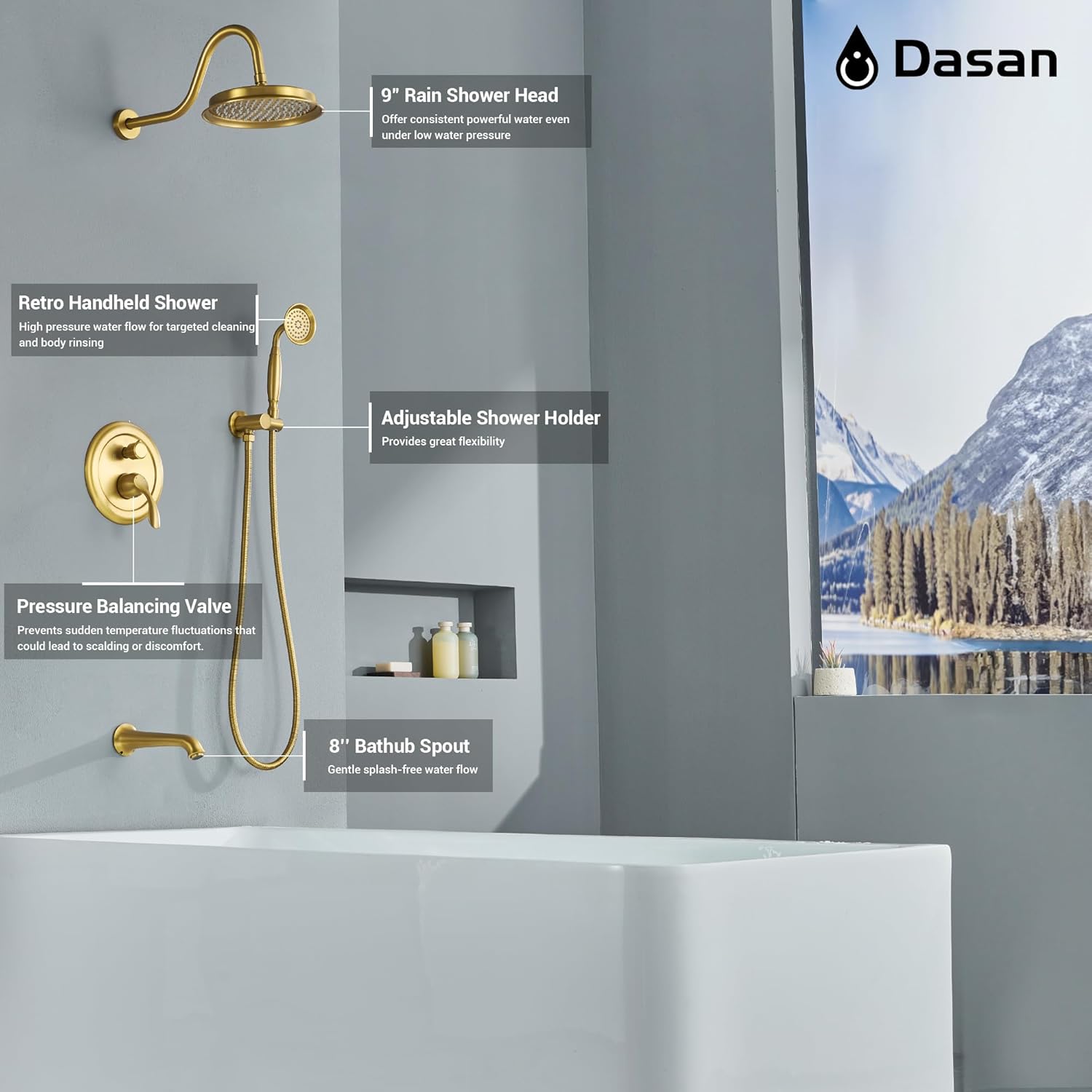 | Included Components | 9'' Shower Head, Aerated Tub Spout, Handheld Shower Wand, Pressure Balance Rough-in Valve, Shower Valve Trim Kit |