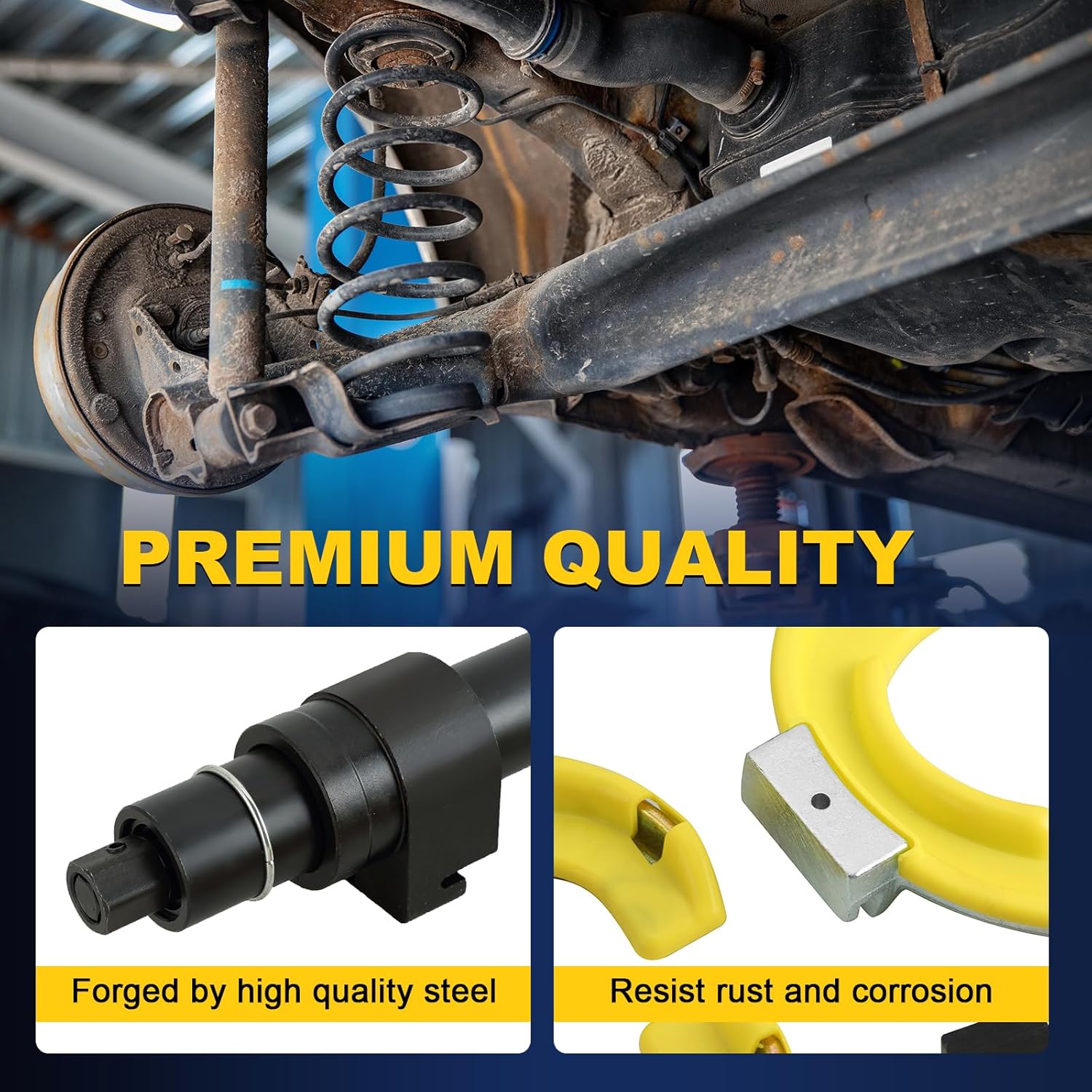 Features: Designed to withstand extreme pressure day after day in any environment. The broad spring contact and built in safe lock help to lock the spring into place for safer This Tools Strut Spring Compressor quickly and safely compresses the spring for easy replacement of the strut cartridge or strut assembly repair. Perfect tool for the DIYer or the professional mechanic. Caution: A compressed spring can inflict bodily injure, always wear safety glasses and gloves Instructions: 1. lubricate both main shafts with oil. 2. Align the hooks with the safety pins backed off so the hooks will fit over the spring3. Position both set of hooks 180° a part, opposite each other.4. Push safety lock in the lock position on hooks.5. Using a 3/4"or 19mm socket and ratchet turn the main shaft compressing the strut spring enough to safely remove the fastener nut holding the cartridge
