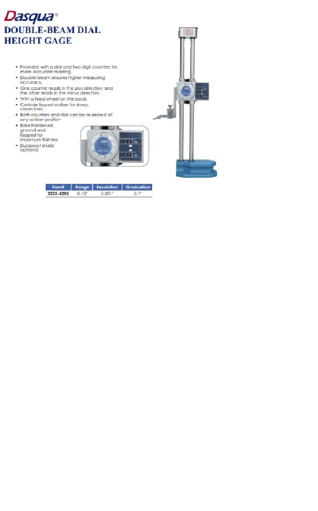 Dasqua 0-12" double-beam dial height gage. Large easy-to-read digital display. Double stainless beams assure high accuracy. Zero-setting can be obtained throughout the gage's range. Separate counters register both upward and downward travel. Hardened, stainless steel bar for long life. Carbide tipped scriber for sharp, clean lines. Base is hardened, ground and lapped for maximum flatness. Resolution is 0.001". Counter graduation is 0.1".