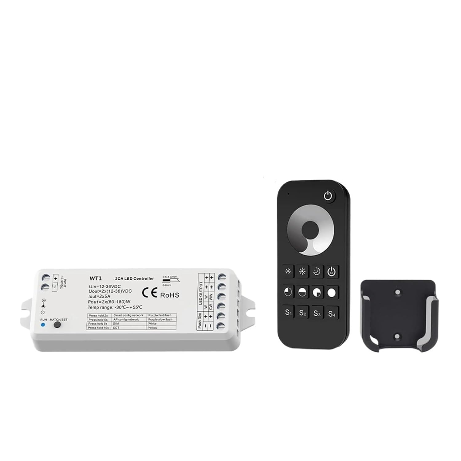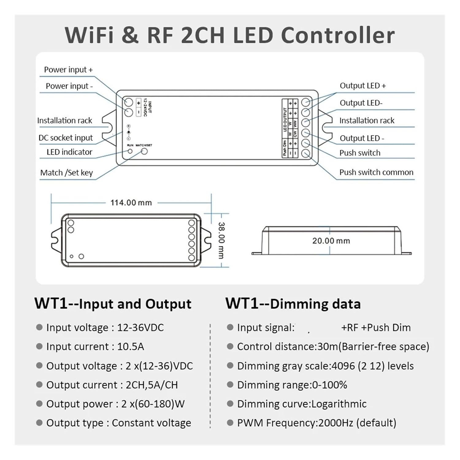 Outlet & Switch CombosFeatures: DimmerModel: WT1Certification: CCC, CE, ROHS, ULMaterial: plasticmaximum. Load power: 360WProduct Type: DimmerOrigin: Mainland ChinaInput signal: ++Push DimInput voltage: DC 12-36VOutput current: 2CH, 5A/CHFeature 1: LED dimmer 12vFeature 2: LED light strip dimmerFeature 3: 12v LED dimmer, LED dimming controllerFeature 4: LED dimmer switchFeature 5: LED dimmer 24vFeature 6: LED light dimmer