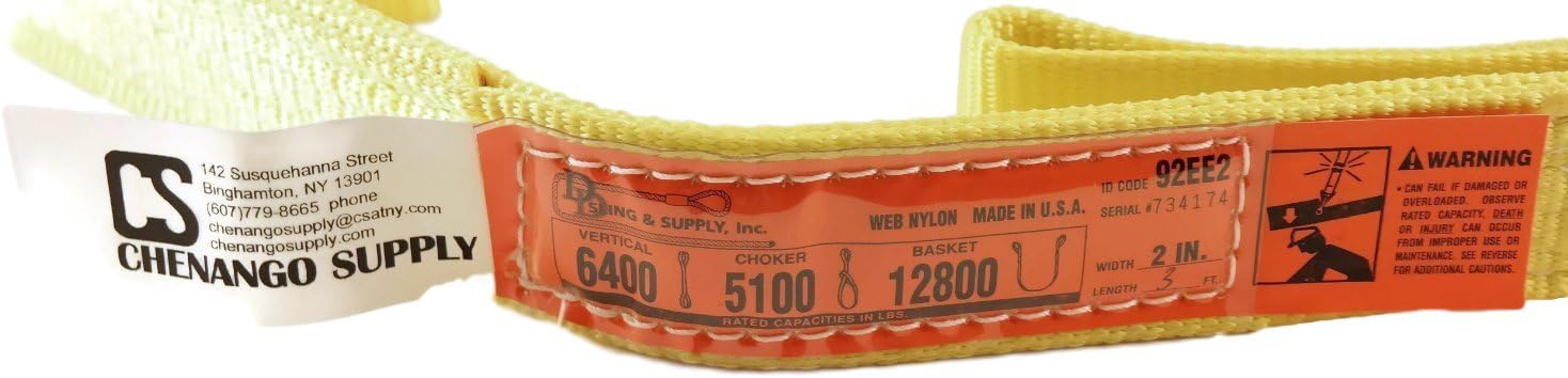 USA-made Type 3 heavy duty nylon flat eye and eye sling engineered for lifting and rigging applications requiring documented load ratings, flexibility, and traceable construction. Specifications Width: 2 inches Length: 3 ft Type: Type 3 flat eye & eye (EE), eyes aligned with sling body Material: Nylon, 2-ply heavy duty 900 webbing Vertical capacity: 6,400 lbs Choker capacity: 5,100 lbs Basket capacity: 12,800 lbs Serial-numbered ID tag included Country of origin: Made in the USA Performance & Construction This Type 3 flat eye and eye sling features flat loop eyes on each end with openings aligned to the sling body, allowing use in vertical, basket, and choker hitches. The nylon construction provides flexibility, light weight, strength, and non-marring performance, while the 2-ply heavy duty 900 webbing supports durability in repeated lifting operations. Each sling includes the Original Guaranteed ID tag with inspection sheet, care, use, and maintenance information. The tag features a 2-part design with extra heavy gauge, super double-polished clear cover with Ultra-Violet and MR inhibitors, flame-retardant treatment, oversized lettering visible from up to 8 feet, and unique serial numbers for inspection criteria and traceability. Industrial Use Cases Used in construction lifting, equipment maintenance, fabrication shops, warehouse material handling, hoisting operations, and general industrial rigging applications where crews depend on consistent sling performance and documented load capacities. Quality & Trust Assurance Manufactured in the USA using high-quality nylon materials and specialty thermal printing to support long-term tag legibility and traceability. Built for professionals who require dependable stitching quality, accurate load data, and consistent performance in critical lifting operations.