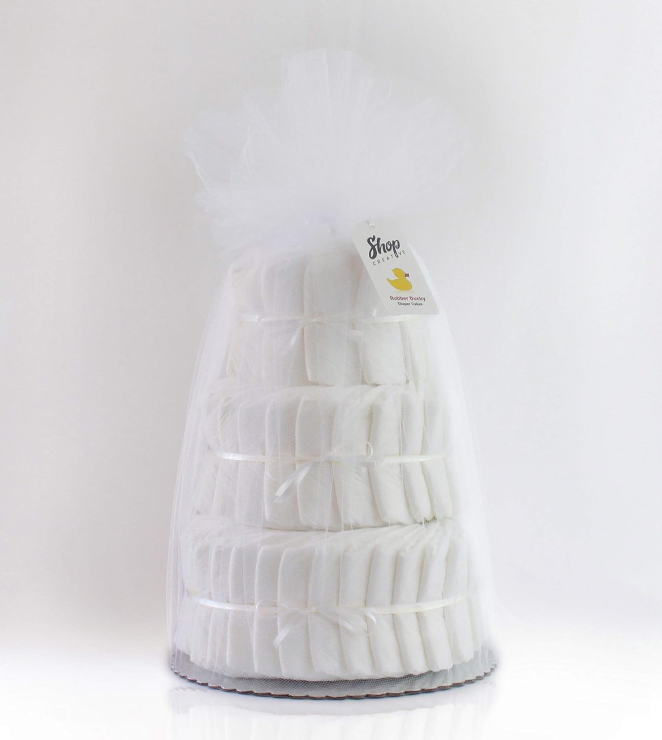 You've seen all the fancy diaper cakes online and you're either thinking, "I can do that!" or you have a very specific baby shower theme and you "can't find one that matches just right!" We've done the hard part for you and now you can let your imagination run wild. Don't get stuck buying a whole box of cake boards, or trying to figure out how to wrap the cake-it's all included: 60 stage 1 Pampers Swaddlers (because they're oh so soft and ultra, pure white), Wilton cake board, Gift Wrapped In Tulle.