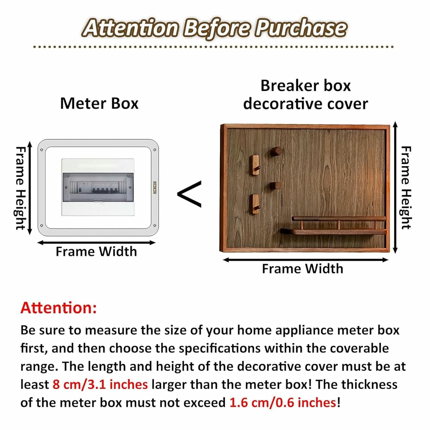 Transform your home decor with our modern decorative wall panels - the solution for covering your electric meter box while adding a stylish touch to your space. In addition to their decorative value, our wall panels also serve a practical function. They come with built-in storage hook racks, giving you a convenient place to hang items such as keys, bags or coats. Our modern decorative wall panels are versatile and can a variety of surroundings. They are designed to fit standard-sized electric meter boxes and Can meet your needs.Specifications:- Product Name: Electricity Meter Box Cover- Frame Material: Solid wood- Color: Red , Coffee- Style: Modern, Simple- Size: 59x39 cm/23.22x15.35 in , 49x59 cm/19.29x23.22 inFeatures:Flip-top design, easy to open and close, labor-saving.Widely used to hide electrical boxes and unsightly holes.Switchboards from water, dust and daily wear and tear.Away from the power supply and prevents electric shocks.Package contents include:1 x Meter box cover + Corresponding installation accessoriesAttention:-Please measure the size of the switchboard before purchase. The length and height of the decorative cover must be at least 8 cm/3.1 inches larger than the meter box! The thickness of the meter box must not exceed 1.6 cm/0.6 inches!The products for sale do not include decorative accessories.