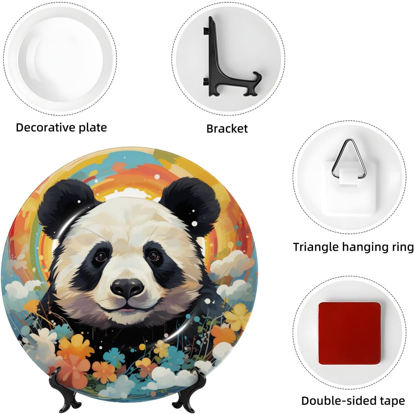 gokays decorative platedo you feel that your table is monotonous? Then use our decorative plate to add a little fun to the monotony of life.featuressize - 6 inch diameter;7 inch diameter;8 inch diameter;10 inch diametermaterial - ceramic design - Rainbow Cartoon Panda package - 1 x ceramic decorative plate, 1 x stand, 1 x pothookwhy choose gokays decorative plates?advantageas manufacturers we follow current trends and bring you the latest home fashion. Salad plates ideal for placement at home or in the office. Traditional porcelain making technology, fine workmanship. Ceramic dinner plates is a good gift for family and friends.convenient to useour dinner plates rack for display has 2 ways to use, you can just place the bracket base on a flat surface first, and then put the plate on it, also you can stick the provided pothook at the back of the plate, and then stick the plate on the wall, you can choose the suitable installation method according to the actual situation.occasionour ceramic ornaments salad plates is a perfect decorative and collection for any niche, table, or mantle at your home. Perfect for your office, home, living room, dining room, playroom, kitchen, cafe, study, studio, club, bar, and others.in a surprise for your family and friends!porcelain dessert plates is a perfect gift for any person in your life. You can give it directly to your lover as mother's day gift/father's day gift/birthday gift/christmas gift/valentines day gift/anniversary gift/wedding gift/housewarming gift/new home gift.start with our funny decorative plate, refresh your rooms!
