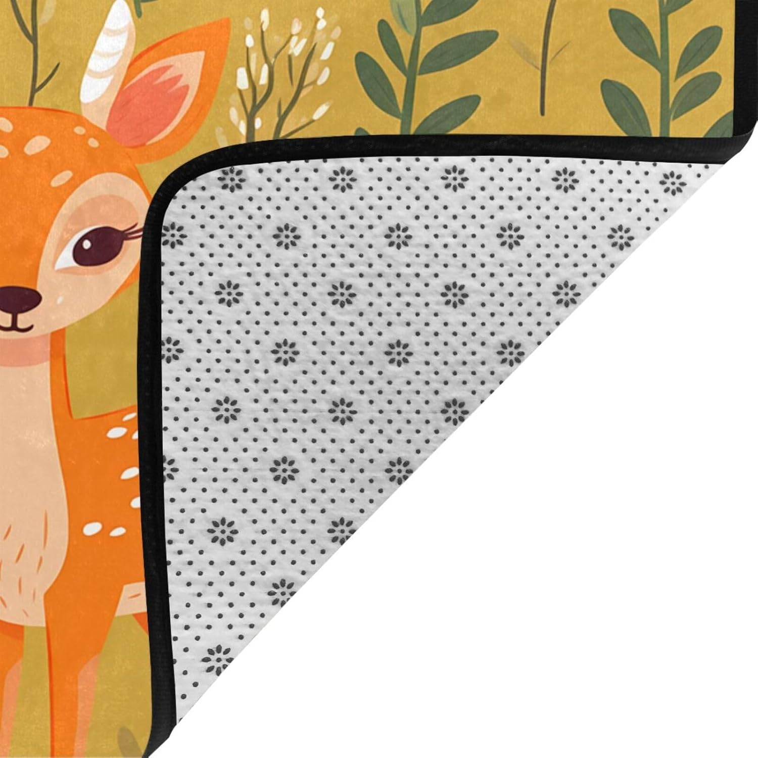 This deer motif printed decorative carpet is made of polyester flannel, which is delicate and soft to the touch, with tight and regular pile. It will not pill or fade after long-term use, and will always look like new. The middle layer uses high-density memory foam, which can automatically adjust according to the foot shape and pressure, providing precise massage for tired feet and relieving fatigue. The bottom is designed with non-slip plastic bottom non-woven fabric, which can firmly grip the ground even when it encounters water or on smooth surfaces, ensuring the safety of the elderly and children. It is easy to clean daily, can be machine washed or hand washed, and is wear-resistant and does not shed. Exquisite stitching technology and high-quality tailoring, with smooth edges, are suitable for a variety of scenes such as bathrooms, living rooms, and bedrooms. Non-slip, comfortable, and durable, adding a touch of intimacy and elegance to your life.