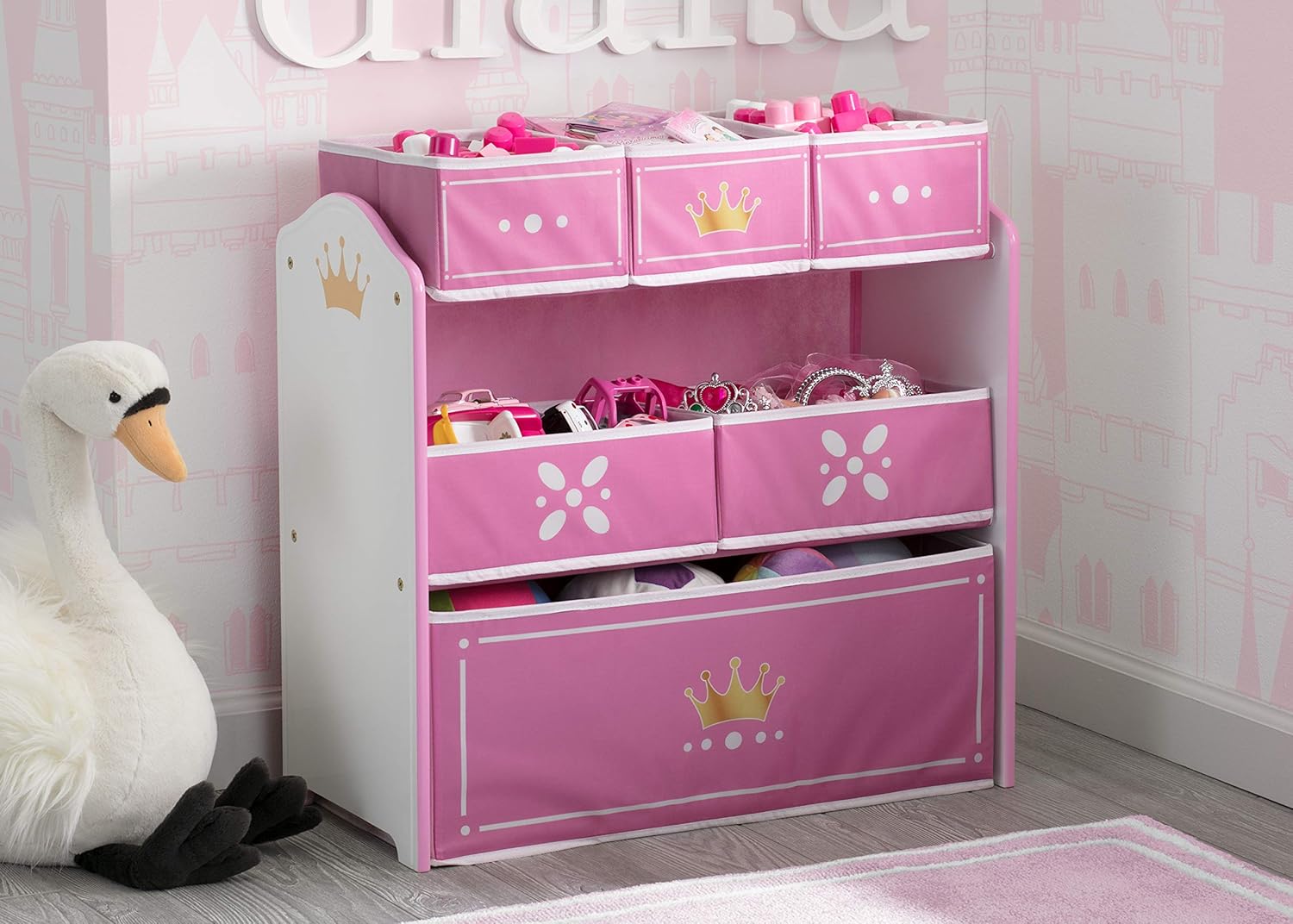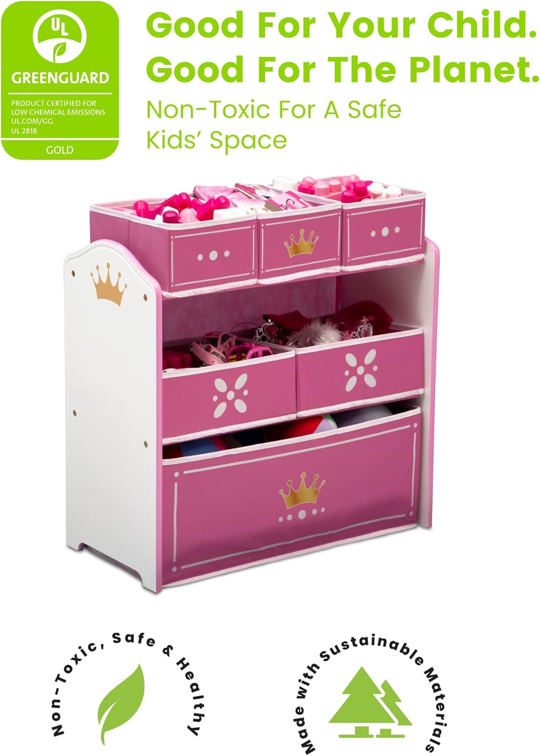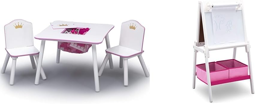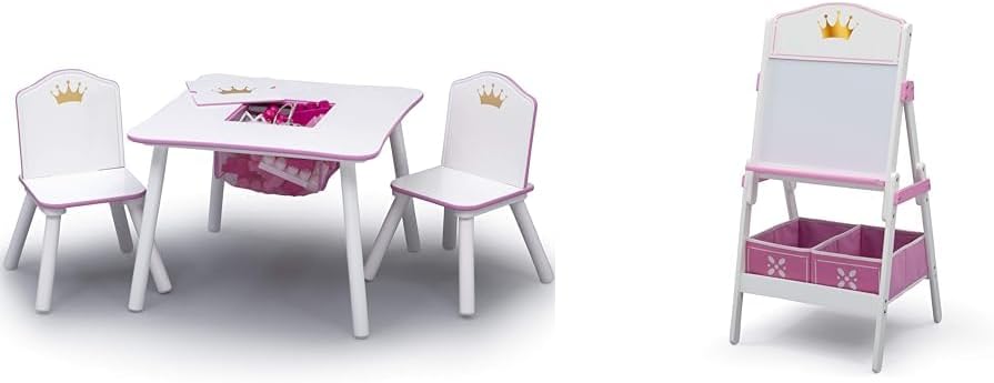 Delta Children Princess Crown Kids Wood Table and Chair Set with Storage - Greenguard Gold Certified, White/PinkThe Princess Crown Kids Chair Set and Table from Delta Children is fit for a fairytale. The set includes two chairs with metallic gold crown emblems on the backs and a coordinating table with a storage cubby in the middle to keep art supplies or toys. The perfect place to hold court, tea parties, tackle art projects or eat, this durable wood chair set and table will encourage a fun environment for your little one to learn and play. The Princess Crown Kids Chair Set and Table coordinates with other items in the Princess Crown Collection from Delta Children. Delta Children was founded around the idea of making safe, high-quality children's furniture affordable for all families. They know there's nothing more important than safety when it comes to your child's space. That's why all Delta Children products are built with long-lasting materials to ensure they stand up to years of jumping and playing. Plus, they are rigorously tested to meet or exceed all industry safety standards.Delta Children Princess Crown Design & Store 6 Bin Toy Storage Organizer - Greenguard Gold Certified, White/PinkOnce upon a time, in a faraway land, there was a messy kingdom that was saved by the Princess Crown Multi-Bin Toy Organizer from Delta Children. Designed to make cleaning up a royal adventure, this storage piece features metallic gold crown emblems and six fabric bins in a variety of sizes to help keep toys, books and crafts organized. Plus, it pairs perfectly with other items in the Princess Crown Collection from Delta Children. Delta Children was founded around the idea of making safe, high-quality children's furniture affordable for all families. They know there's nothing more important than safety when it comes to your child's space. That's why all Delta Children products are built with long-lasting materials to ensure they stand up to years of jumping and playing. Plus, they are rigorously tested to meet or exceed all industry safety standards.