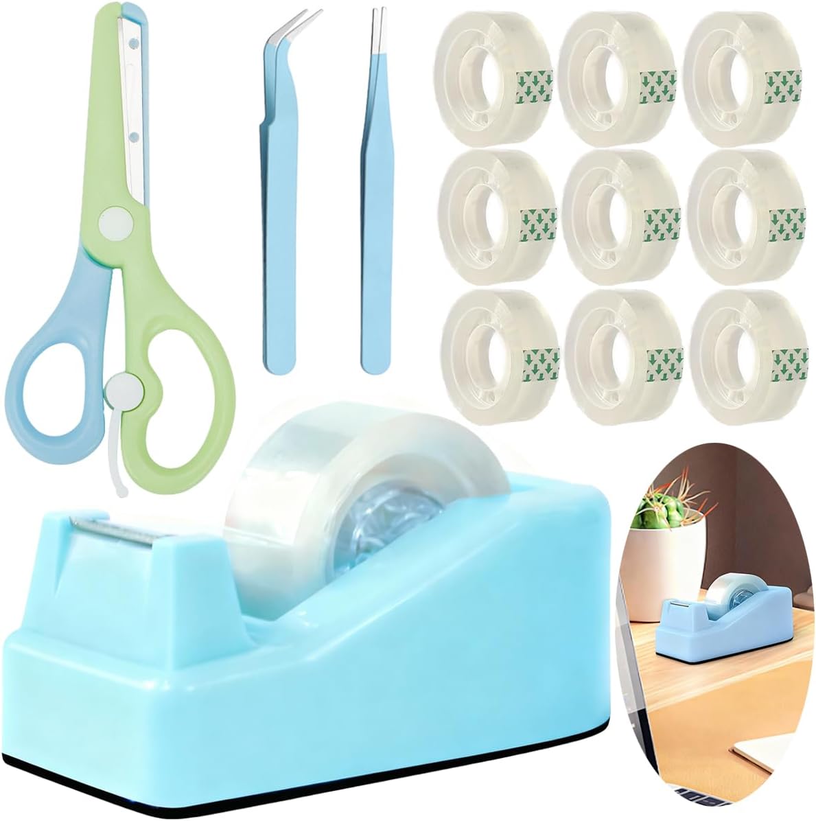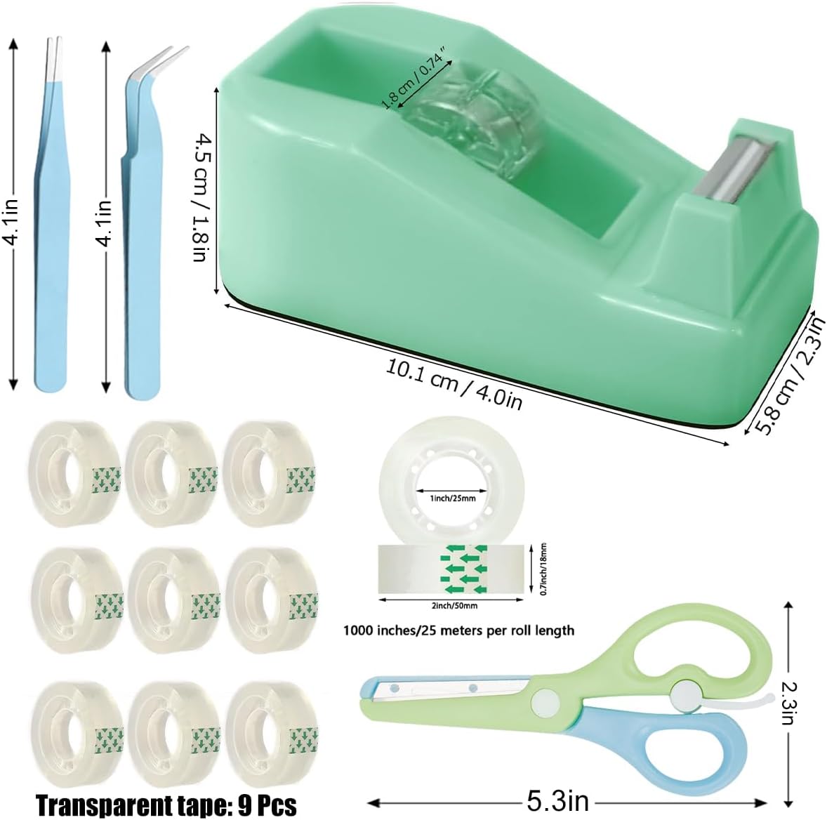 Transform your workspace with this practical desktop tape dispenser in green, featuring a weighted nonskid base that ensures stability during one-handed operation. The dispenser comes generously equipped with 15 rolls of crystal-clear transparent tape, each measuring 0.71 inches wide by 500 inches long. Perfect for home offices, classrooms, or business settings, this dispenser's solid construction and non-slip base prevent it from sliding or tipping during use. The convenient design allows for quick and easy tape dispensing while keeping your desk organized. With its ample supply of included tape rolls, you'll be well-stocked for all your sealing, wrapping, and mounting needs. The dispenser's smooth cutting edge ensures clean, precise tape cuts every time, making it an essential tool for daily use.