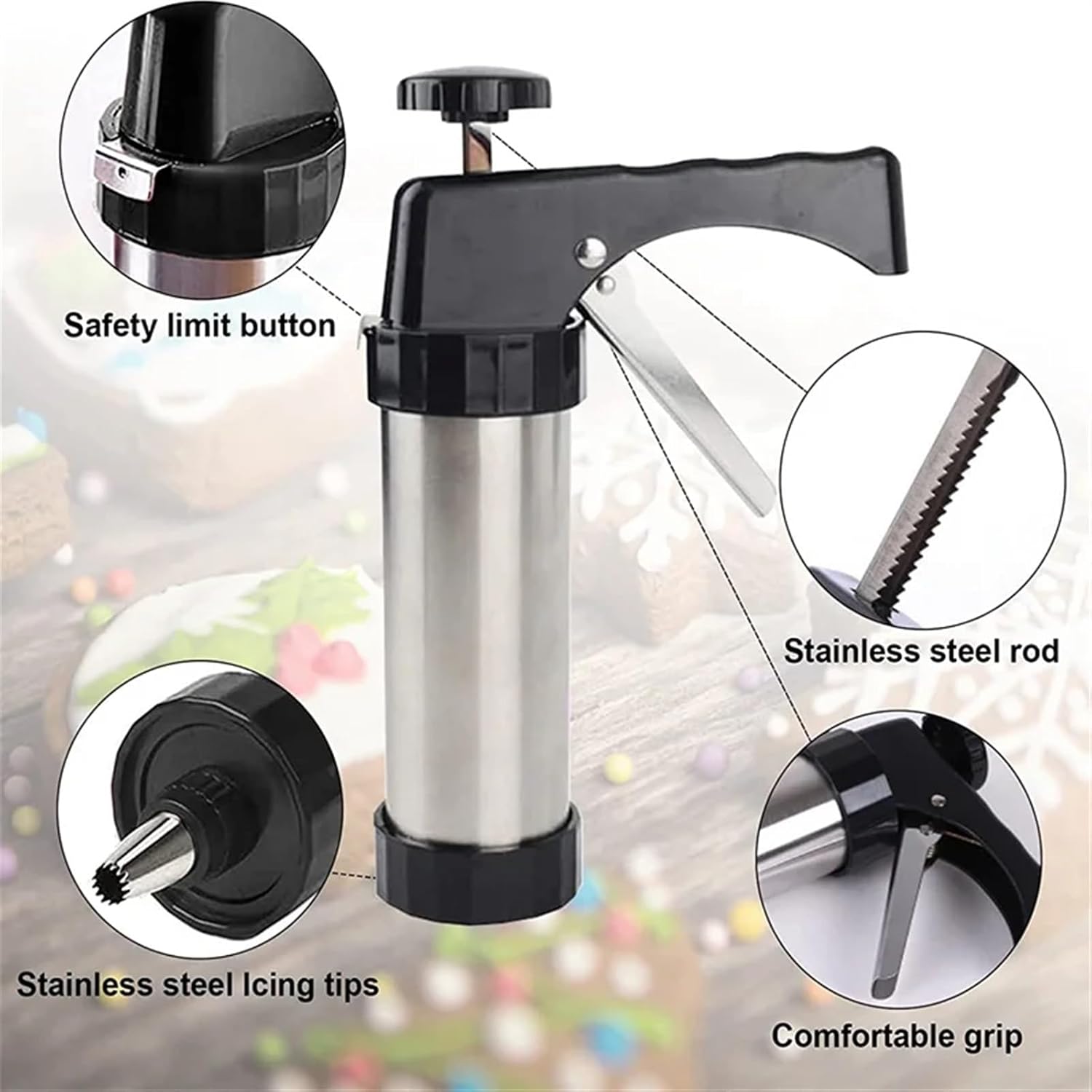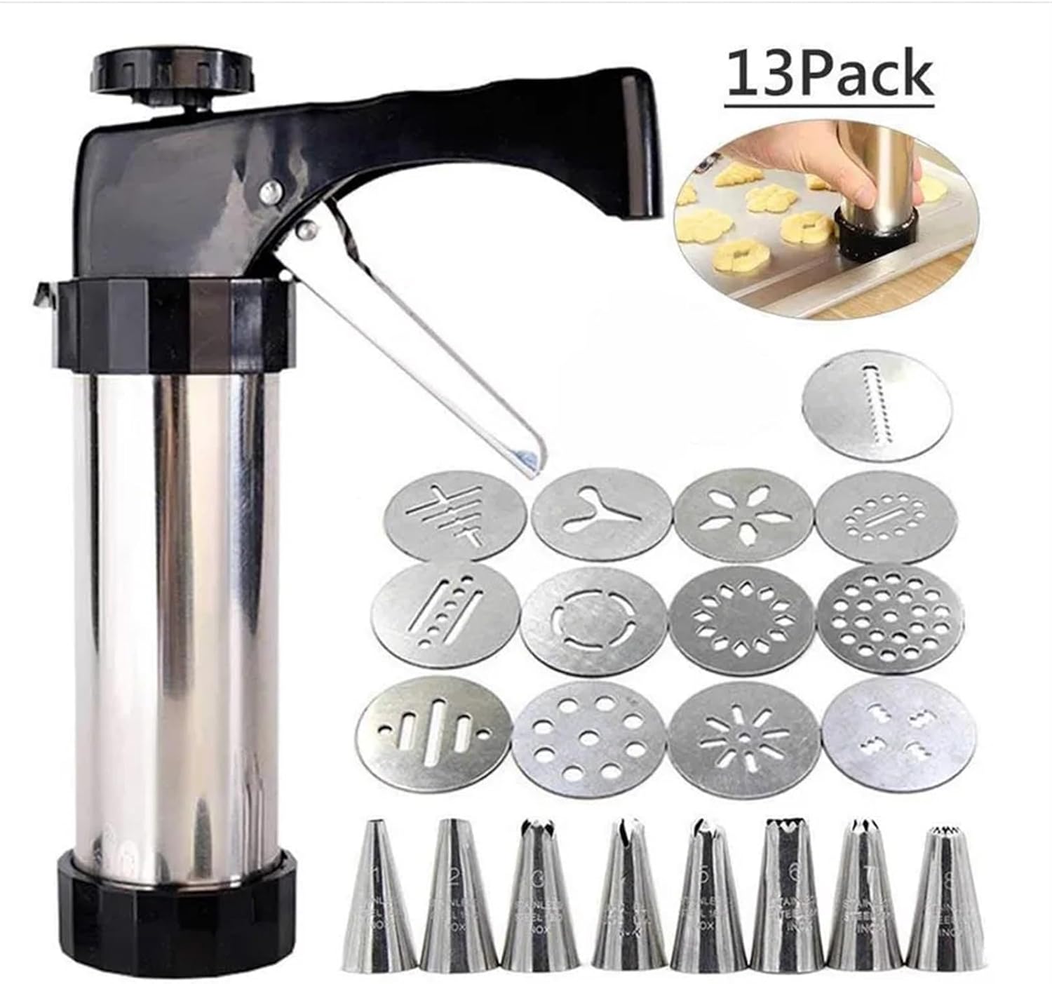 The compact and portable design of the Dessert Syringe Kit makes it easy to store and transport, fitting neatly into any kitchen spaceDescription:- Biscuit press: You can easily make different creative cookies and decorative cupcakes at home. Make your kitchen party beautiful and enjoy spending time with family or friends.- Accessories: This baking biscuit press includes a stainless steel biscuit maker, 13 plates and 8 frosting tips. You can use stainless steel nozzles to make different beautiful decorations for the cake.- Easy to use: detachable structure, easy to load and unload, easy to clean, very suitable for beginners and experienced professionals. Use this cookie press. Each part of the biscuit press can be easily disassembled, so you can easily clean the biscuit maker.- Simple and fast: Simply turn the knob to easily adjust the size of cookies from large to small; It can produce 35 to 40 small cookies and 20 to 25 large cookies.Material: stainless steelSize: 22 * 13CM