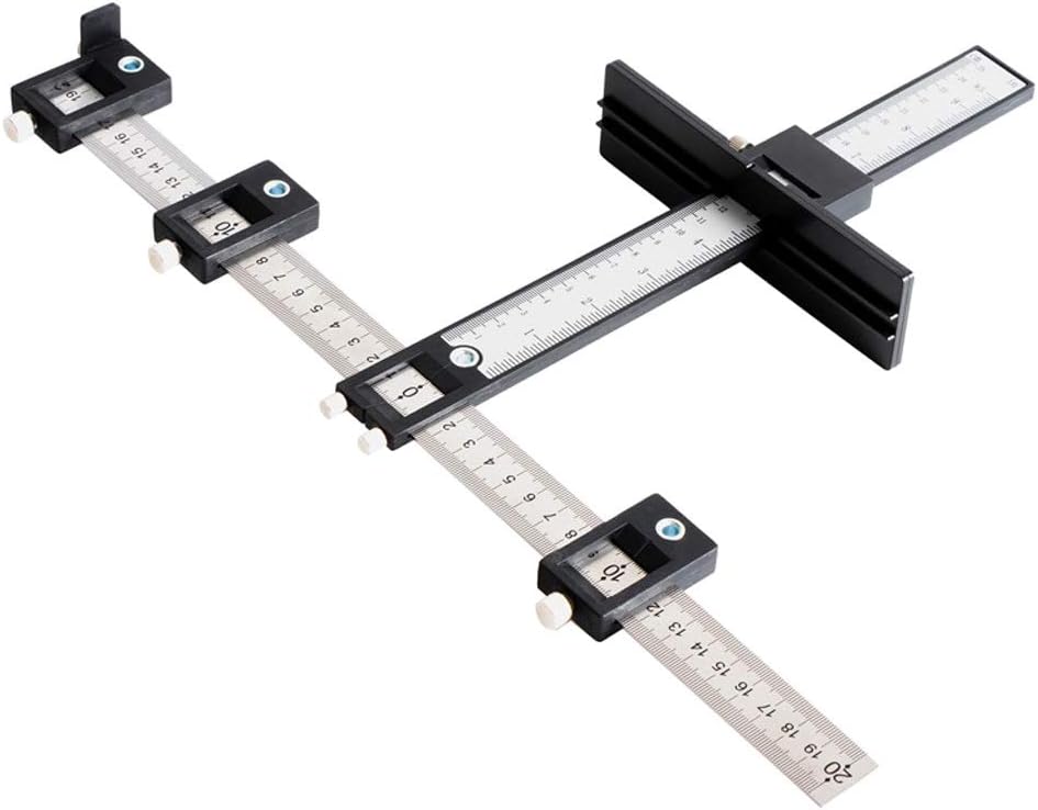 Features: - Front-mounted clamp handle makes clamping easy.- Stop-collar setting block makes drill bit setup easy.- The quick-release drill guide block makes set up simple.- Set it up once and use it repeatedly with no further measurements.- This template jig lets you measure out perfect hole positions for cabinet handles, pulls, and knobs.- A multiple purpose template for precise installation of pulls/knobs on drawers and doors, the L-bracket and top's screws keep it dialed in horizontally and the two large front thumbscrews locks in the vertical position.Specifications:Material: ABS+Stainless steel+Aluminum alloyPackage included:1 x Stainless Steel Ruler1 x Aluminum Alloy Ruler3 x Guide BlocksNotes:1. Manual measuring, please allow 1 ~ 3mm error,thank you.2. Due to the difference between different monitors, the picture may not reflect the actual color of the item. We guarantee the style is the same as shown in the picture.