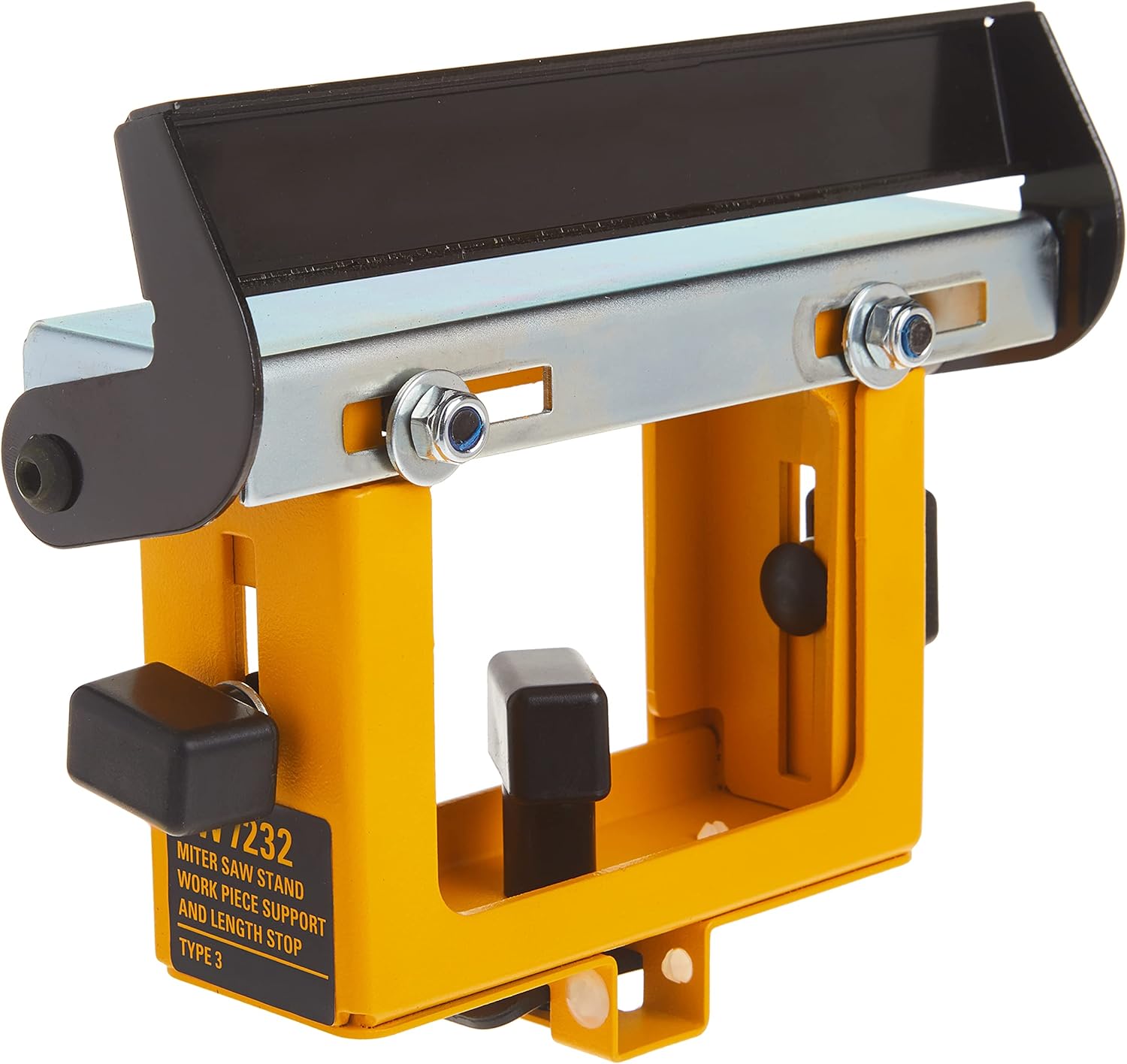Product Description The DW7232 Miter Saw Stand Material Support and Stop supports work pieces when cutting and can be easily repositioned anywhere along the rail. Features flip-up stops for quick conversion to a cut stop and height adjusts from 3-7/8-inch to 6-inch to match miter saw table heights. Compatible with DW723, DWX723, and DWX724 Miter Saw Stands. From the Manufacturer DEWALT DW7232 Miter Saw Workstation Work-Piece Support and Length Stop