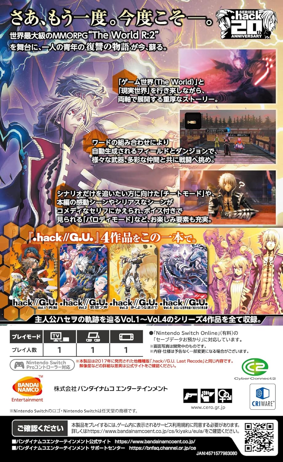 .hack//G.U. includes all 4 .hack//G.U. titles (Rebirth, Reminisce, Redemption, and Reconnection) in one single integrated experience. Immerse yourself in "The World", a VRMMORPG filled with monsters, magic, and chaos. Follow Haseo as he hunts down a legendary Player Killer (PK) named "Tri-Edge" who PKed his friend Shino and sent her into a coma in real life. Journey to the mysterious online world of .hack and experience an RPG like never before! *****Game has Japanese/English audio with English subtitles*****