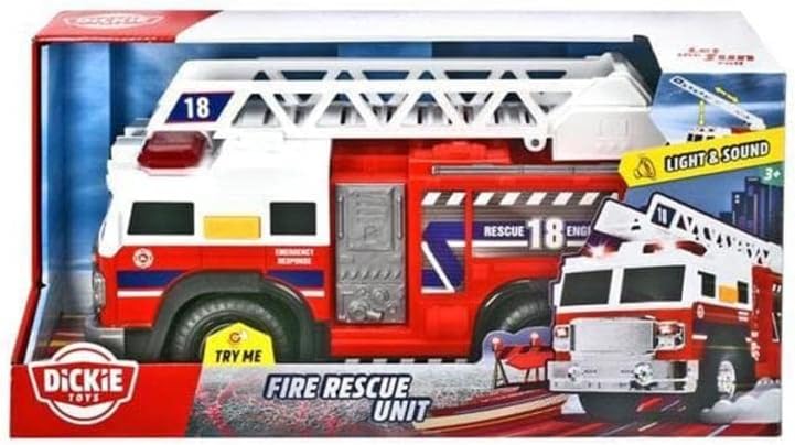 The Fire Rescue Unit Truck From Dickie. Save the day with the Fire Rescue Unit from Dickie Toys. This cool rescue truck is just what you need to rescue civilians trapped in burning buildings Race through the streets and use the extendable ladder to reach up high. Team up with the local Fire Truck and save your city from dangerous fires. This authentic rescue truck is approximately 30cm long and available in a red and white design with moveable parts, chunky wheels and real light and sound functions. Discover the entire collection of amazingly detailed city vehicles from Dickie Toys and create your own cityscape with all your favourite trucks, cars and service vehicles. Reach Up High With The Expanding Ladder. Tall buildings are no match for the Rescue Unit Truck. Grab your rescue team and engage the large extendable ladder on the back of the truck to quickly reach people trapped in all locations The Dickie Rescue Truck is a fantastic toy vehicle for little ones who love being the hero of the day. With free-wheel technology, they can whiz around the city from location to location, saving people from disaster and making the city safe again. Light and Sounds Bring The Fun To Life. The Rescue Unit Truck from Dickie brings playtime to life with a highly detailed exterior with chrome finishing, plus real lights and sound features, moving parts and wheels. The red warning lights on the truck’s roof light up, and the truck even makes authentic siren sounds when in use When there’s a fire, the Rescue Unit Truck will be there to help get you to safety without a hitch thanks to the extendable ladder. Help keep your city safe every day with the Rescue Unit Truck. Playtime Vehicles The Whole Family Can Enjoy. The Rescue Unit Truck is suitable for children over three years due to its small parts. Dickie is passionate about creating realistic toys for little boys and girls, focused on authenticity and performance. The truck is a realistically scaled rescue vehicle with a detailed exterior, chrome finishing and a bright red and white design children will adore. With various themes and collections to choose from, your little one is guaranteed to find the perfect Dickie toy to suit their interests.