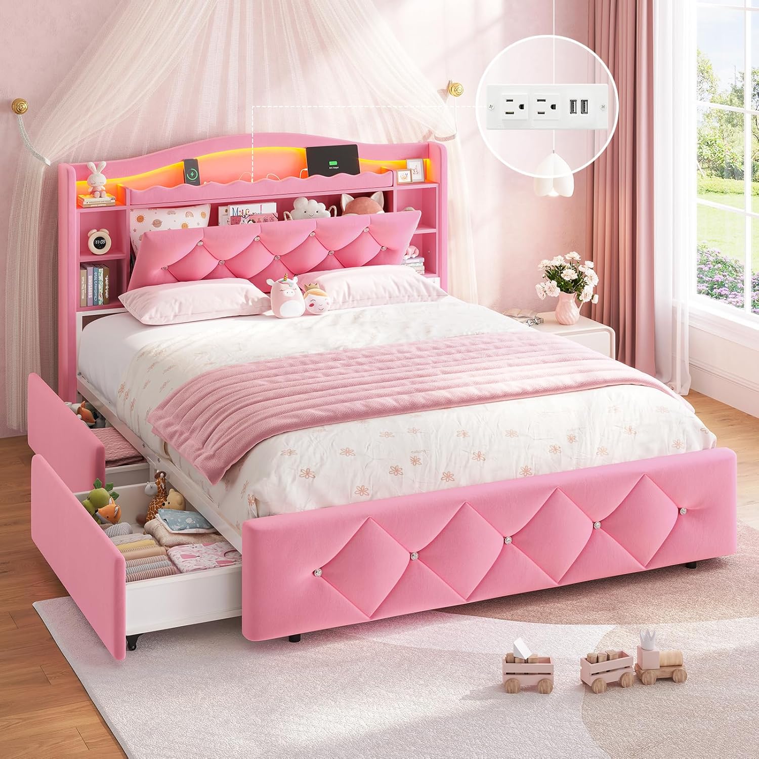 | Additional Features | 2 Enlarge Storage Drawers, Bookcase Headboard and Hidden Storage, Chic Castle Headboard Velvet Princess Bed, Heavy Duty Metal Support, LED Lights and Charging Station |