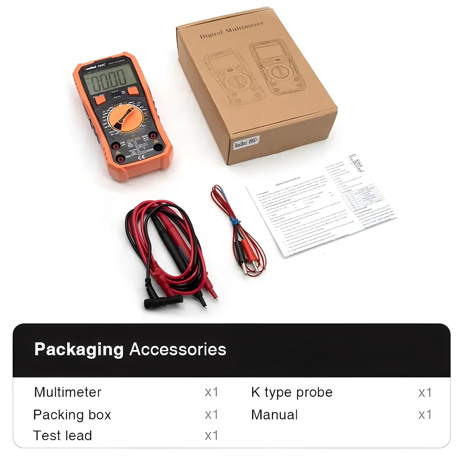 VC890C+ Digital Multi-meter 2000 Counsts Manual Range True RMS Capacitance Resistance Transistor 1000V 20A 20MΩ 1. SUMMARIZE This meter is a stable Multi-meter with 28mm LCD display, driven by battery. It's widely used on measuring DCV, ACV, DCA, ACA, resistance, capacitance, frequency, diode, transistor, continuity test and with the function of auto power off and backlight The meter takes integrated circuit as the core. It’s an ideal tool for lab, factory, wireless lover and family. 2. OPEN PACKING FOR CHECKING Open the box, take out the meter, check the items below if they are missing or damaging: 1.5V AA LR6 Battery * 2pcs; Manual * 1pc; Test lead * 1pair 3. SAFETY NOTE The meter meets the standards of IEC61010 (the safety standards or equal GB4793.1 standards request issued by IEC) Read the operation manual carefully before operation. 3-1.Do not input limit over-ranged. 3-2.The voltage below 36V is safety. To avoid electric shock, check whether the test leads connection is correct and insulation is fine when measuring over 36V DCV or 25V ACV. When input over 24V ACV or DCV, the warning symbol for high voltage will display 3-3.Remove the test leads when changing function and range. 3-4.To select correct function and range, beware of error operation; For your safety please note, although there is protective function of whole range for this series meters. 3-5.Do not operate the meter if the battery and back cover is not fixed. 3-6.Do not input voltage when measuring resistance, capacitance, diode, continuity test. 3-7.Remove test leads from test point and turn off the power before replacing battery and fuse.