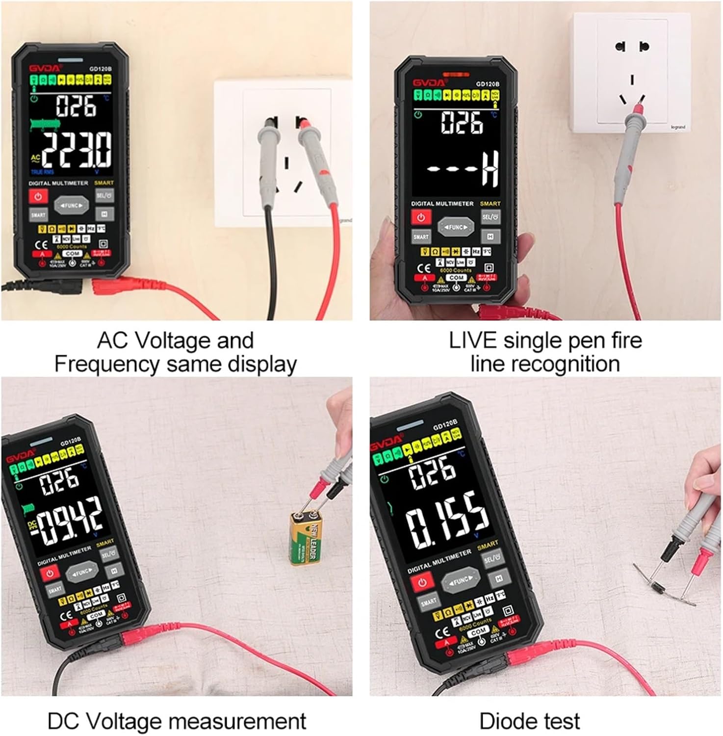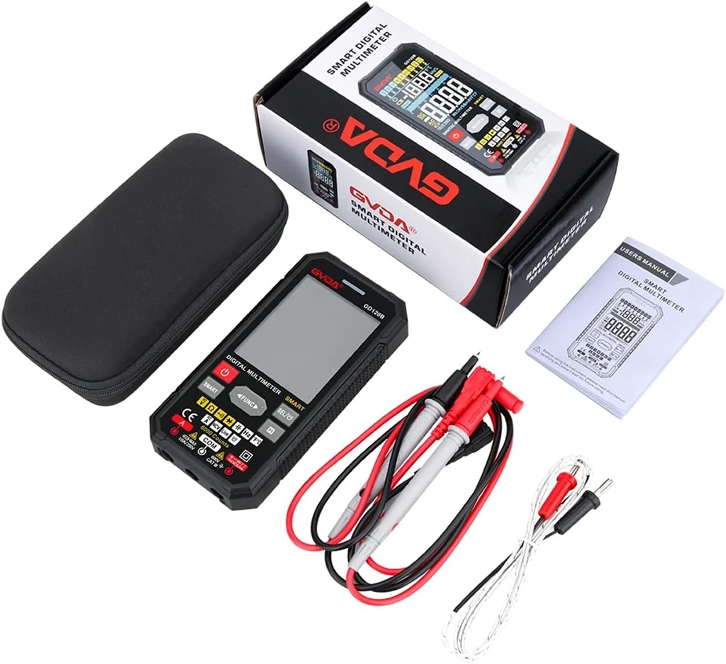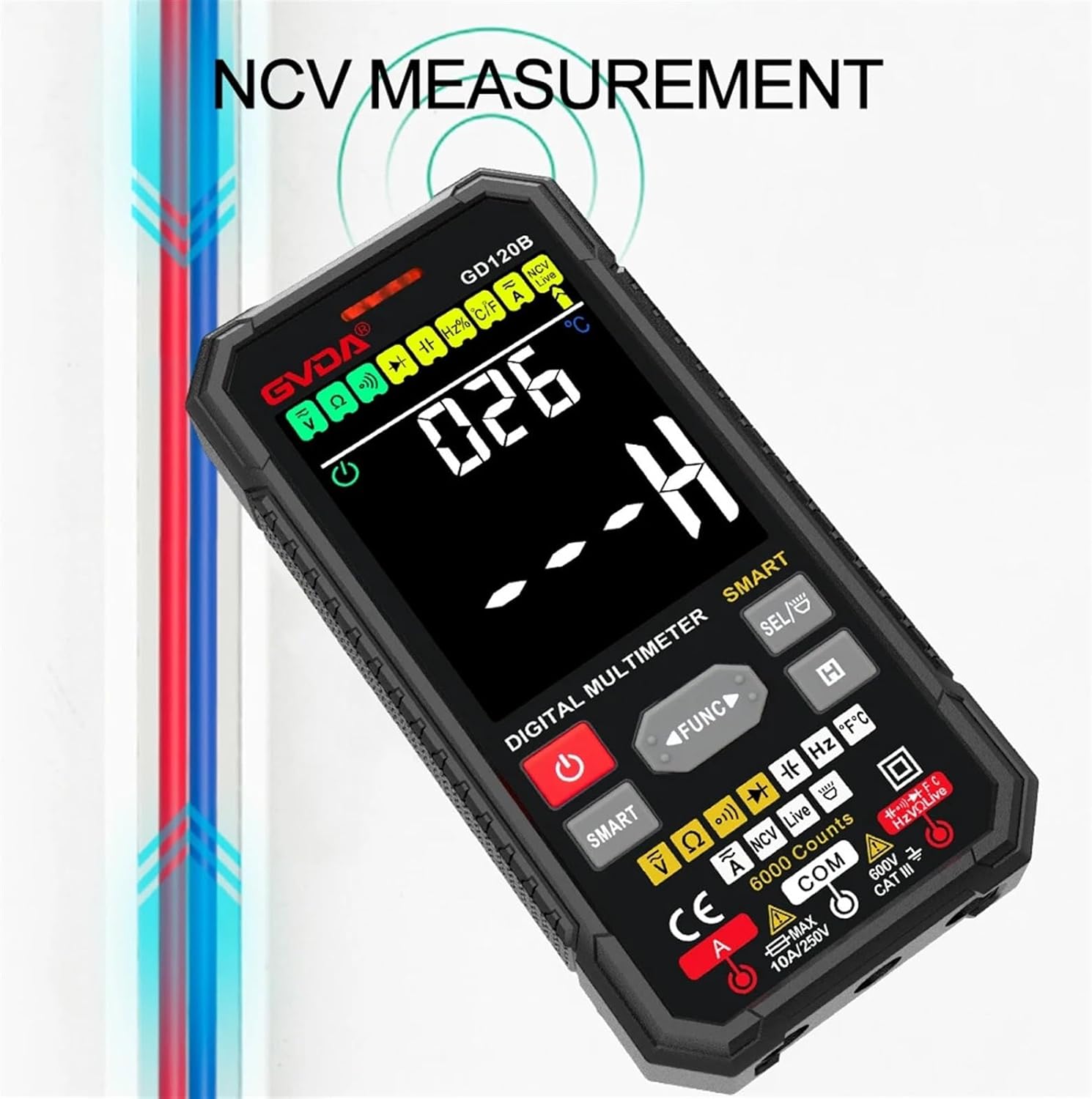 Multimeters & AnalyzersProfessional Multimeter True RMS Auto Range NCV DC AC Voltage Tester Voltmeter Temperature Measurement Smart Multi-meter Digital Multimetro This meter is an intelligent true RMS digital multimeter. It has intelligent and professional measurement function. Full function, with gear display, analog bar multiple display.It has a sampling speed of 3 times per second.Product Features1) HD Colour LCD Display2) Maximum display: Maximum 6000 Counts display3) Non-contact AC voltage detection4) Sampling Rate: About 3 times per second5) Over range display: the highest position shows "OL"6) Low voltage display: low battery indication<;80%8) Power Supply: 4x1.5V Batteries ( NOT include)9) It is stable performance, high precision, high reliability clear readings, and overload protection.Product Specification1, DC voltage: 600mV,6V,60V,600V,±(0.5% +3)2, AC voltage: 6V,60V,600V,±(0.8% +3)3, Resistance:600,6K,60K,600K,6M,±(1.0%+5);60 M, ±(1.5%+10)4, AC/DC current: 600mA,6A,10A,±(1.2%+3)5, Capacitance: 6nF,60nF,600nF,6uF,60uF,600uF,±(4.0%+5);6mF,60mF,±(5.0%+5)6, Frequency: 6Hz,60Hz,600Hz,6KHz,60KHz,600KHz,6MHz,10MHz, ±(1.0%+3);1.0~99.0%,±(1.0%+3)7, Temperature:-40~ 0,±3; 0 ~ 1000, 2.0% or ±28, Temperature unit:C/F9, MAX. Voltage between terminals and earth ground:DC/AC 600V10,Fuse protection: F10A/250V fuse11,Sampling rate:approx. 3 times/second.12,Display: 6000 counts13,Over range indication: "OL"14,Low battery indication: yes15,Input polarity indication: display "-"16,Smart (AUTO) measurement: yes17,True RMS: yes18,Diode measurement: yes19,Capacitance measurement: yes20,Live wire detecting: yes21,Frequency measurement: yes22,Non-contact AC voltage detection: yes23,Power requirement: 4 x 1.5V AAA batteries(not include)24,Package weight:400g
