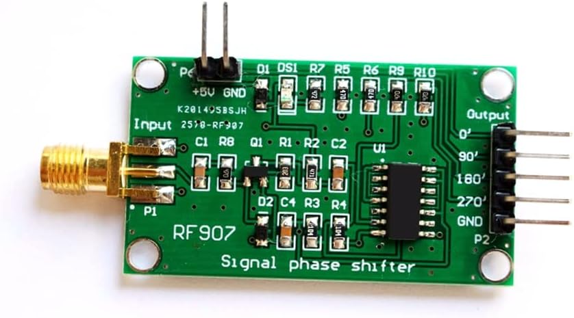 Module parameters 1. Working voltage: 5V 2. Working current: <50mA 3. Input voltage range: +/-0.1V~+/-5V 4. Output voltage range: 5V 5. Input frequency: 50Hz~60MHz 6. Output frequency: (50Hz~60MHz)/4 7. Application range: digital phase shifter design; 8. PCB size: (length) 45mm * (width) 25mm * (height) 10mm Module interface: P6: Power interface (5V). P1: Pulse signal input (+/-0.1V~+/-5V). P2: Pulse signal output interface. 0': Output pulse pulse with phase 0 degree. 90': Output pulse pulse with a phase of 90 degrees. 180': Output pulse pulse with phase 180 degrees. 270': Output pulse pulse with a phase of 270 degrees. GND: negative pole of the power supply Package:1pc Digital Phase Shifter Module 50Hz~60MHz