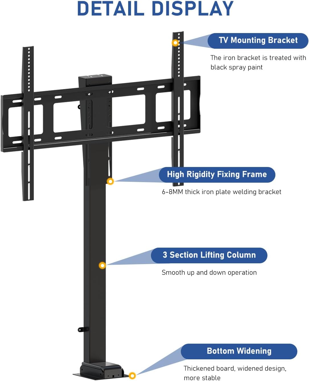 DHLTV electric TV lift is a device specifically designed to control the up and down movement of televisions. According to the size and environment of the TV used, our specifications are divided into 5 types, with a maximum load of 80KG-120KG. We use a Hall control system and can program to adjust the maximum height. 100-240V input, 29V output, with remote control and manual control, both capable of displaying height and programming.